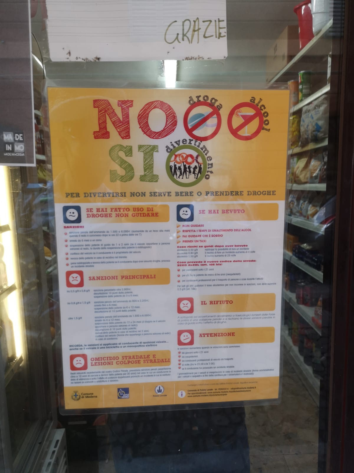Mai mettersi al volante se si è bevuto o si sono assunte droghe. E per divertirsi non c’è bisogno di esagerare con l’alcol o prendere sostanze stupefacenti. Lo ricorda la nuova campagna di sicurezza stradale della Polizia locale di Modena, organizzata grazie anche al coinvolgimento degli esercenti pubblici del centro storico, circa 80 tra bar e negozi di vicinato, ai quali gli operatori stanno distribuendo in questi giorni opuscoli informativi, pensati soprattutto per le fasce più giovani della popolazione, e locandine che saranno esposte in vetrina. “No” alla droga e all’alcol e “sì” al divertimento sono le parole d’ordine dell’iniziativa, finalizzata a richiamare ai comportamenti responsabili al volante e non solo: in caso contrario si rischia non solo di essere sanzionati, ma soprattutto si mette a repentaglio la propria vita e quella degli altri utenti della strada.