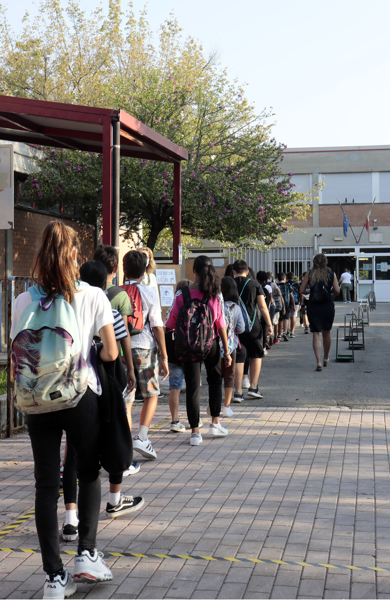 Le aree di attesa destinate a ciascuna classe sono tracciate all’esterno degli ingressi di cui gli alunni devono servirsi secondo le indicazioni già fornite alle famiglie. Alla segnaletica esterna ha pensato il Comitato dei genitori che domenica pomeriggio si è trovato a preparare tutto. Lunedì 14 settembre, dopo un’attesa durata sei mesi i ragazzi, con naso e bocca coperti dalla mascherina che potranno abbassare solo una volta al banco, entrano a scuola, ordinati per classe, in fila indiana e ben distanziati; prima quelli giunti in bici che depositano la due ruote nel porta biciclette, poi tutti gli altri.