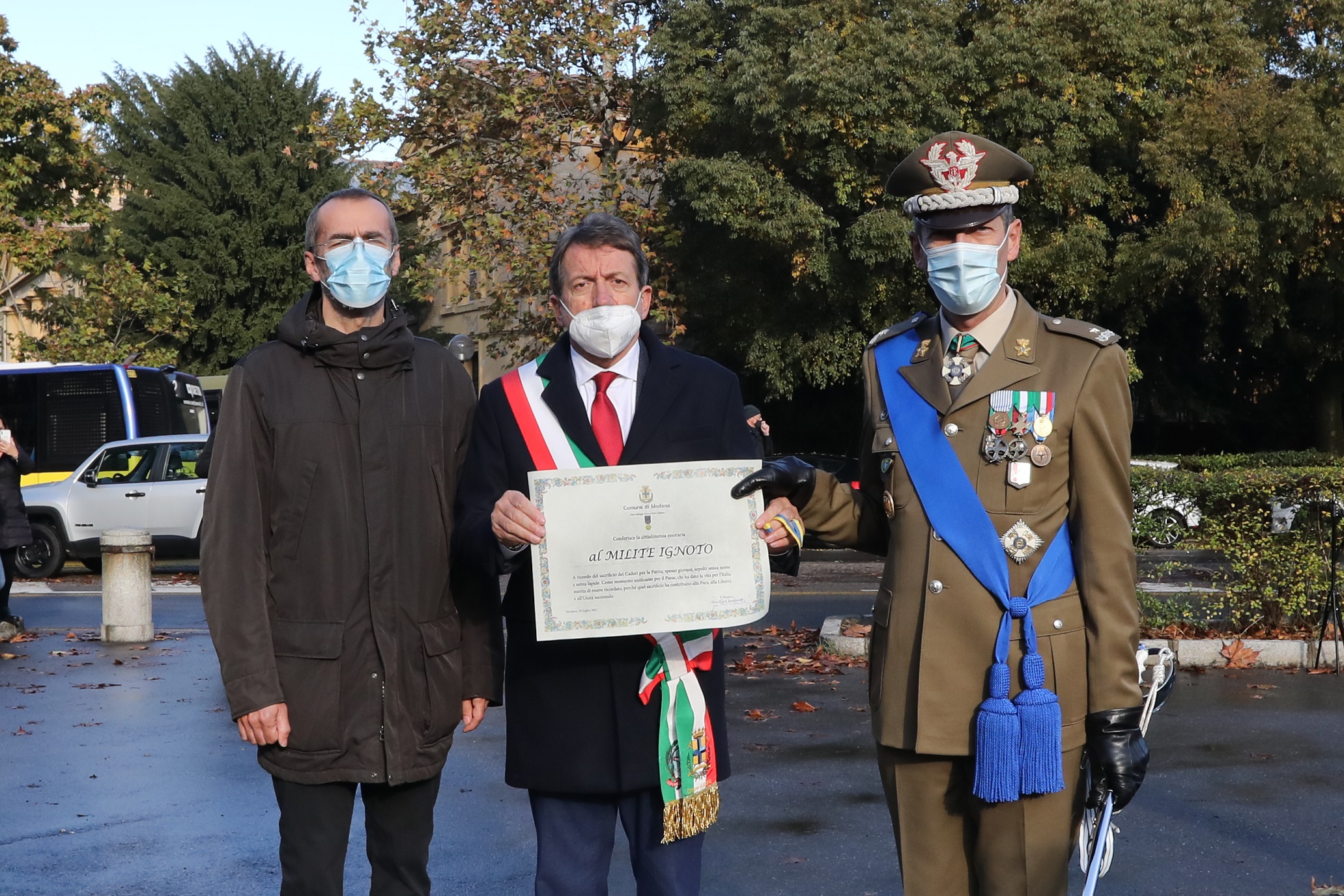 La consegna della pergamena di conferimento della cittadinanza onoraria di Modena al Milite ignoto, come simbolo di unità nazionale e per esprimere il riconoscimento e la gratitudine a tutti i caduti nella Grande guerra e in tutte le guerre, ha rappresentato uno dei momenti principali delle celebrazioni, nella mattinata di oggi, 4 novembre, della Festa dell’unità nazionale e della Giornata delle forze armate e del combattente. Il documento, che riporta la data del 26 luglio, giorno dell’approvazione in Consiglio comunale della delibera sul conferimento, è stato consegnato dal sindaco Gian Carlo Muzzarelli, accompagnato dal presidente del Consiglio Fabio Poggi, al comandante dell’Accademia militare, generale di brigata Davide Scalabrin; nella pergamena, in cui si ricorda che la Città di Modena è medaglia d’oro al valor militare, si sottolinea come l’onorificenza concessa al Milite ignoto nasca “a ricordo del sacrificio dei Caduti per la Patria, spesso giovani, sepolti senza nome e senza lapide” e come la figura del militare senza nome e il successivo omaggio condiviso costituiscano un “momento unificante per il Paese. Chi ha dato la vita per l’Italia merita di essere ricordato, perché quel sacrificio ha contribuito alla Pace, alla Libertà e all’Unità nazionale”.
