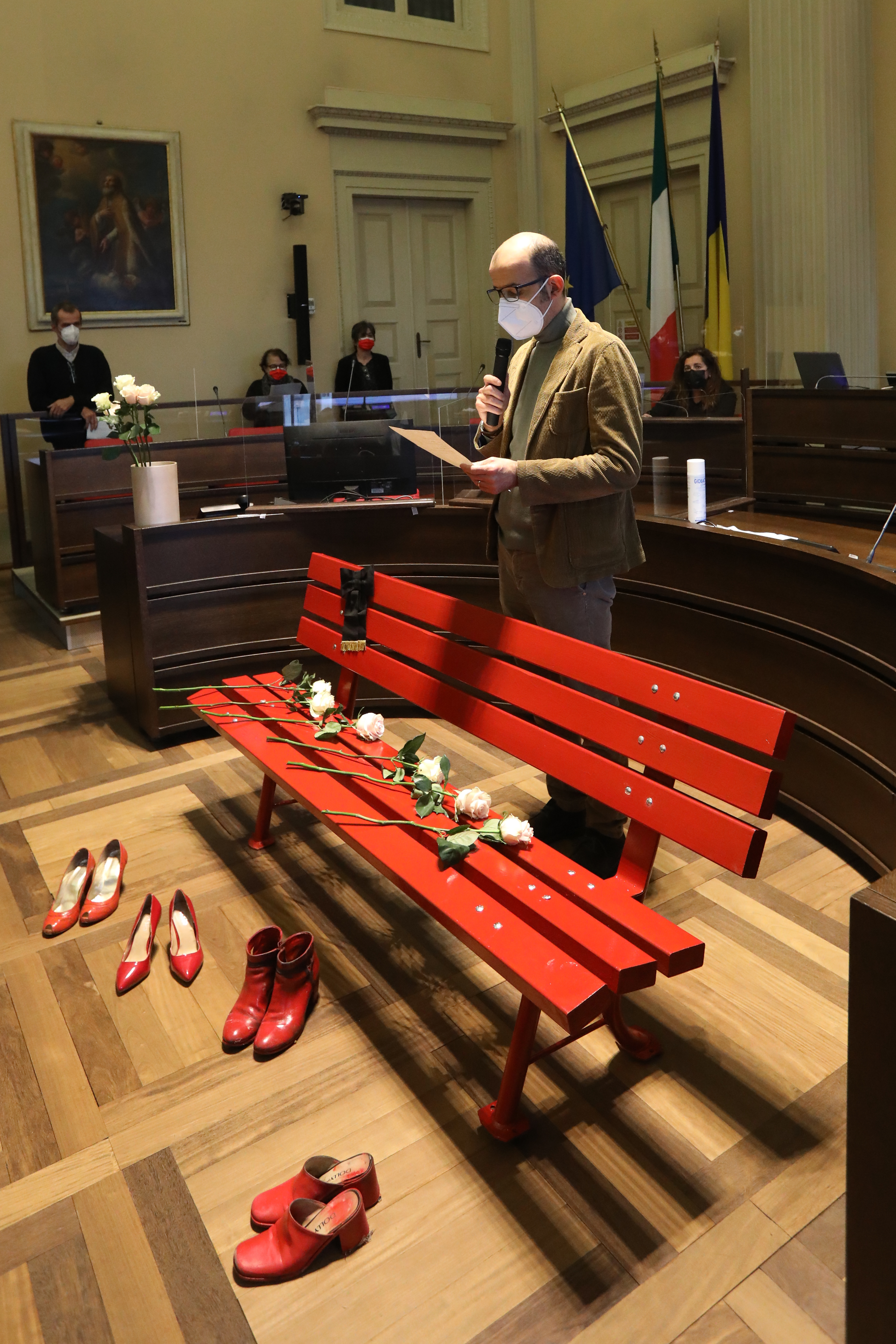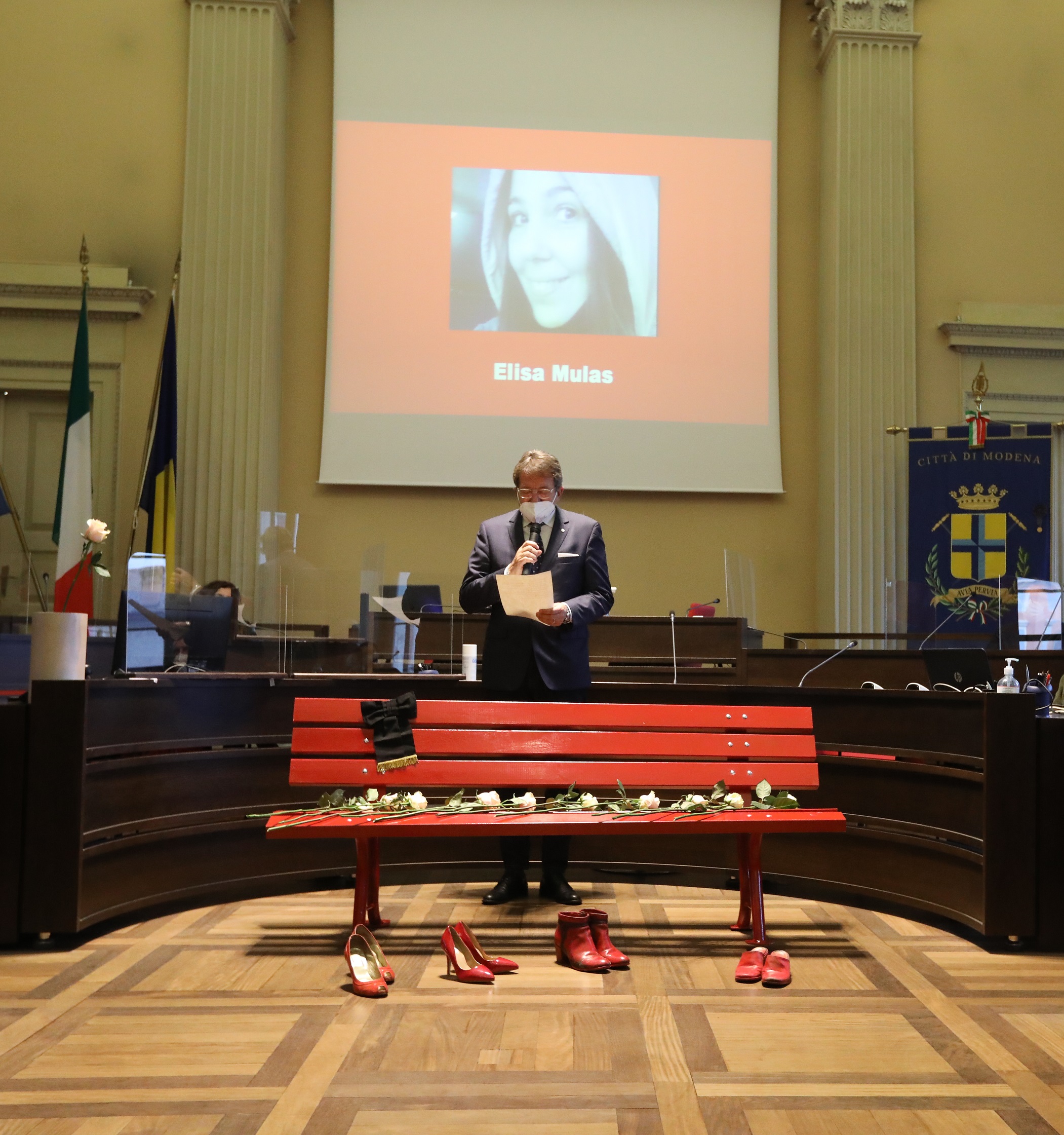 Sono le prime delle undici storie di donne vittime della violenza maschile che sono state lette in Consiglio comunale oggi, giovedì 25 novembre, Giornata internazionale per l’eliminazione della violenza sulle donne, nel corso della cerimonia che ha visto alternarsi alla lettura il sindaco Gian Carlo Muzzarelli, il presidente del Consiglio Fabio Poggi e i nove capigruppo, sulla panchina rossa che è stata installata al centro dell’aula, circondata da scarpe rosse, come simbolo contro la violenza. Le storie sono state scelte per il loro valore simbolico e in rappresentanza di tutte le donne vittime di femminicidio e che subiscono la violenza agita dagli uomini. Al termine di ogni lettura, una rosa è stata posata sulla panchina come memoria.
