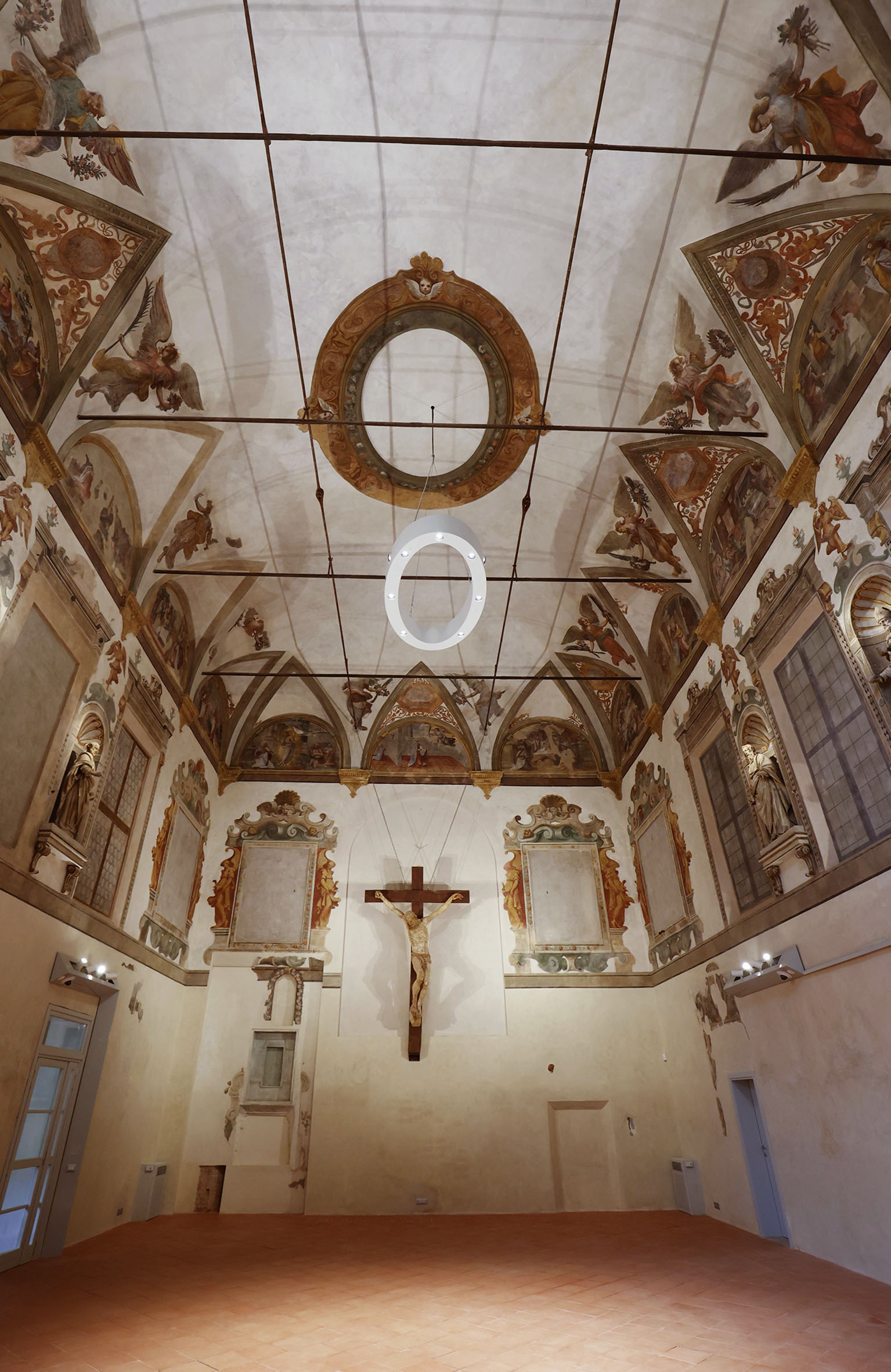 Richiama l’ovato centrale della volta, rilanciandolo in chiave moderna, con linee pulite, un bianco puro e numerosi punti luce in grado di illuminare adeguatamente i dipinti seicenteschi riemersi durante il restauro, il nuovo lampadario installato nella Sala delle Monache all’interno del complesso San Paolo a Modena. E, per un utilizzo estremamente versatile, l’elemento illuminante è dotato di un meccanismo che lo alza e lo abbassa, così da modificare l’illuminazione dell’ambiente a seconda delle esigenze.