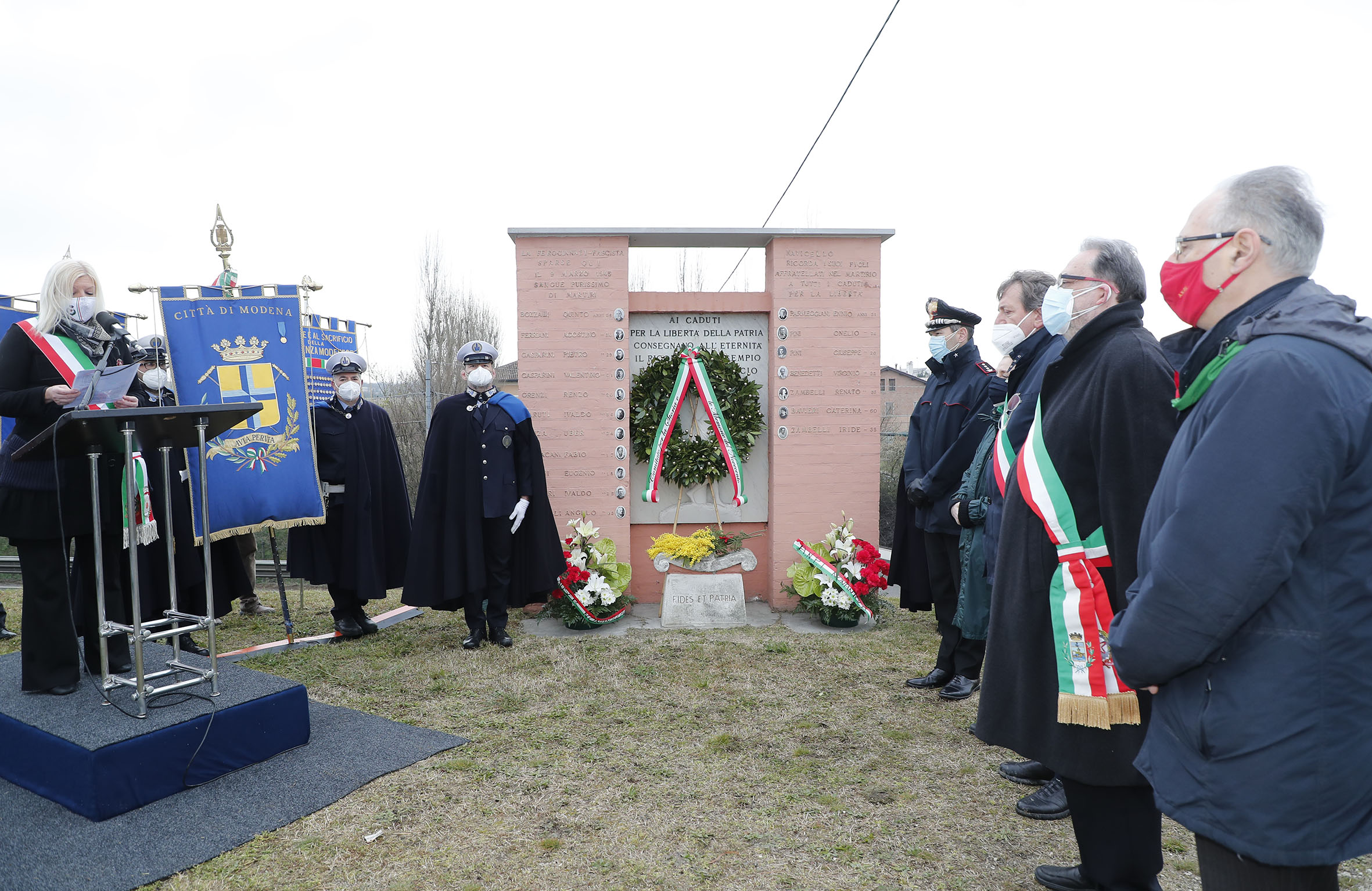 Dopo la deposizione di omaggi floreali al monumento ai Caduti partigiani, la sindaca di Nonantola è intervenuta ricordando la recente scomparsa di Aude Pacchioni (“la partigiana Mimma”) e poi richiamando uno a uno i nomi delle vittime dell’eccidio e salutando, nella diretta streaming, i loro familiari.