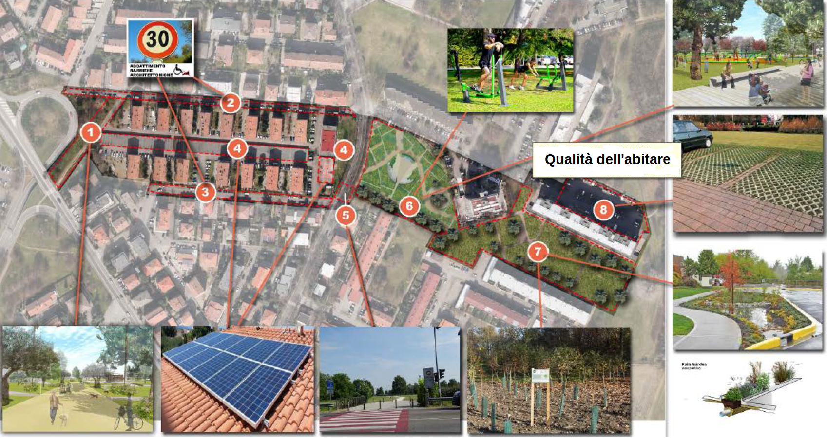 Il progetto candidato al Pinqua prevede una serie di interventi puntuali. Nel comparto compreso tra via Viareggio e via Carrara è previsto il rifacimento della recinzione; la pavimentazione e riqualificazione del percorso pedonale spontaneo sorto di fronte al comparto sul lato del centro commerciale “La Rotonda”, con l’installazione di arredi urbani e la piantumazione di essenze arboree; il ridisegno della sede stradale delle vie Carrara e Viareggio per migliorare gli spazi della pedonalità e della ciclabilità, con la creazione di zone trenta e l’abbattimento delle barriere architettoniche; l’installazione di pannelli fotovoltaici sulla sommità dei garage del comparto di via Viareggio e sulla copertura dell’edificio di testa al comparto, anche pensando alla successiva istituzione di una “comunità energetica”. E ancora, è in programma la realizzazione di un attraversamento pedonale in sicurezza su via Liguria a collegamento delle vie Viareggio-Carrara con le aree del parco; la riqualificazione dell’area verde attraverso l’installazione di attrezzature e percorsi fitness/sportivi, oltre alla realizzazione di un’area dedicata all’aggregazione e alla coesione sociale; il recupero dei percorsi pedonali e ciclabili esistenti con un’implementazione delle piantumazioni e la realizzazione di un ‘giardino della pioggia’ (leggere depressioni del suolo ricoperte a verde con funzione di controllo delle grandi quantità d’acqua piovana) fra i comparti di via Viareggio e via Tignale del Garda; la desigillazione dei parcheggi di pertinenza al comparto di via Tignale del Garda, con la sostituzione della pavimentazione in asfalto con una più drenante (autobloccanti).