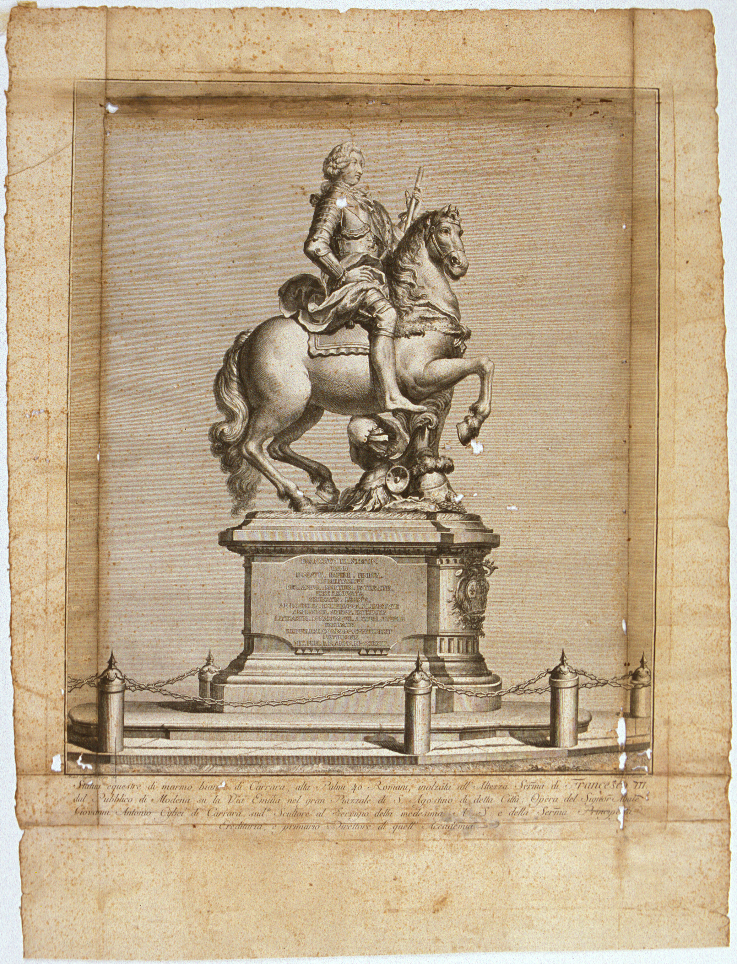 Il monumento equestre, distrutto nel 1796 a colpi di martello dal librario Giovan Battista Fornieri, sull’onda della rivoluzione francese, come riporta la Cronaca modenese di Francesco Rovatti, è oggi testimoniato dall'incisione di Antonio Baratti, di proprietà del Museo Civico, e da un bozzetto in argilla dello stesso Cybei, conservato alla Galleria Estense di Modena.