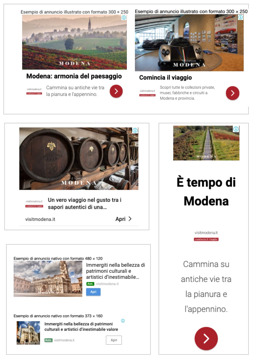 Le campagne sono state impostate su Google (display, rete di ricerca, YouTube) e sui social (Facebook e Instagram) su diverse fasce di pubblico, in particolare tra i 25 e i 54 anni, già segmentate per interesse rispetto alle linee di prodotto proposte da Modena e dal suo territorio.