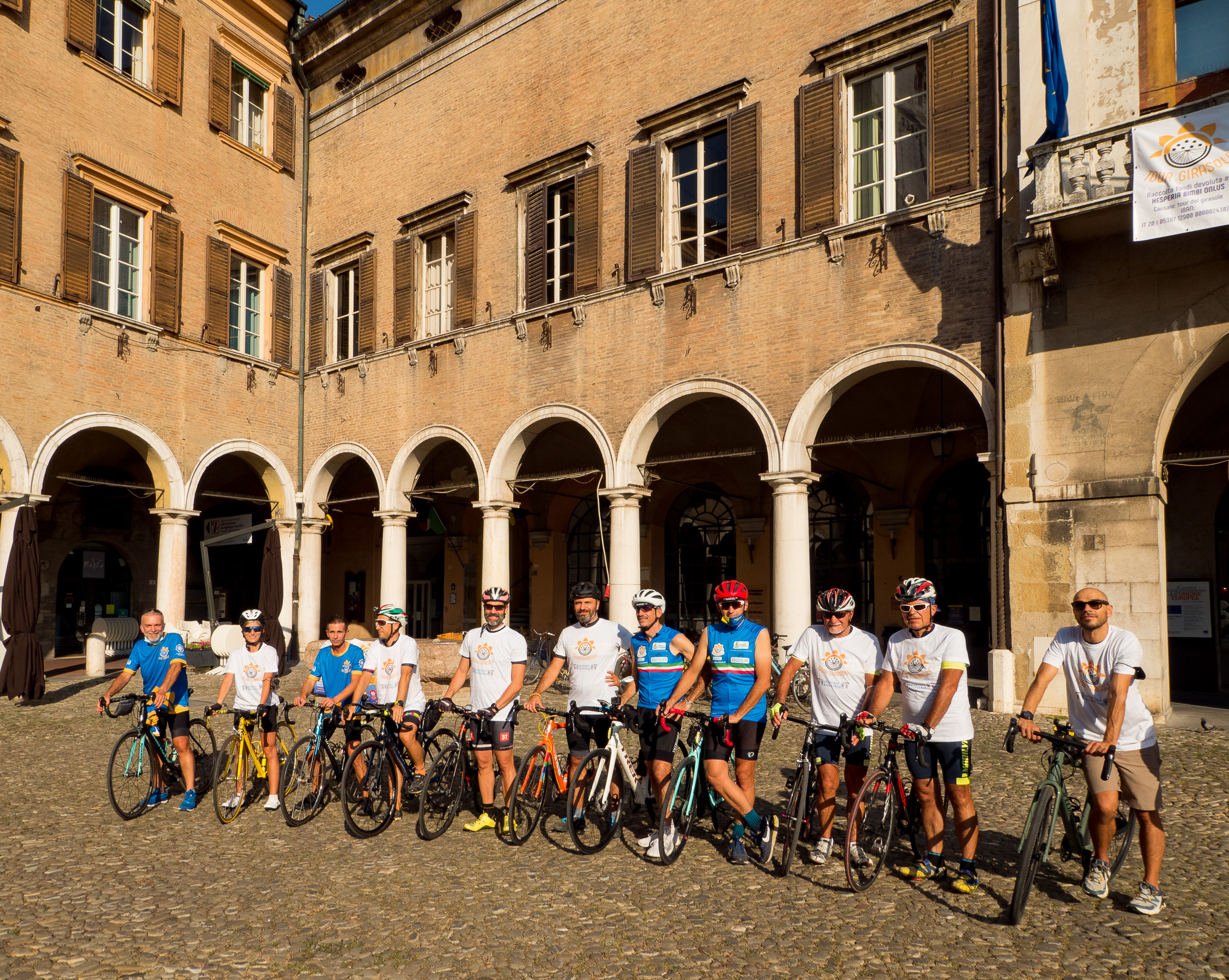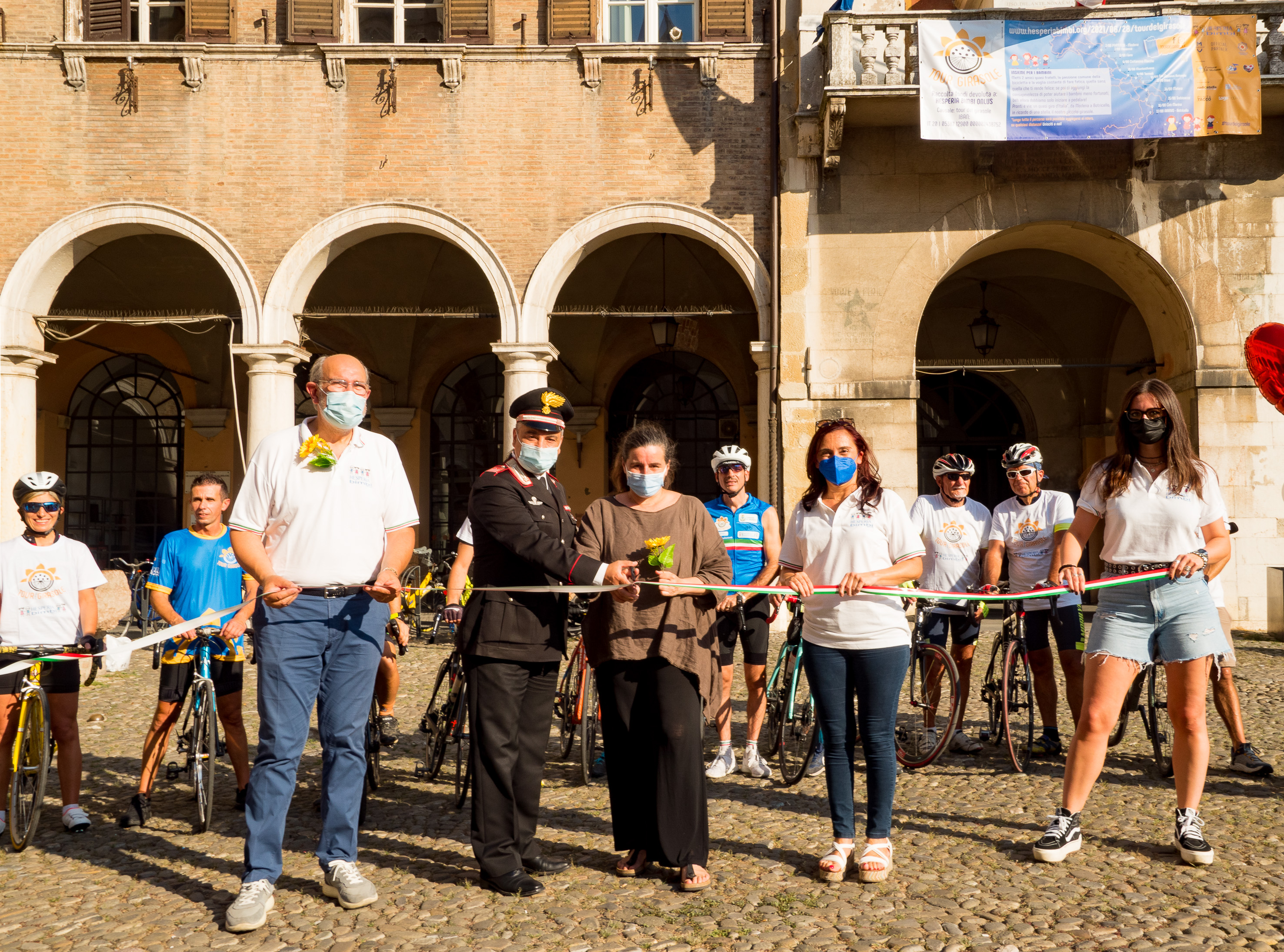 La partenza ufficiale del Tour del Girasole, che ha il patrocinio del Comune di Modena, è stata data nel pomeriggio di venerdì 6 agosto in piazza Grande dall’assessora all’Ambiente Alessandra Filippi, in rappresentanza del Comune, che ha sottolineato il valore di un’iniziativa “di solidarietà concreta che si realizza grazie all’impegno e all’entusiasmo di tante persone di buona volontà”. A salutare i ciclisti anche Paolo Pisani e Lisa Morandi, presidente e coordinatrice di Hesperia bimbi onlus, i cui volontari il prossimo ottobre partiranno per una nuova missione in Albania. L’associazione effettua interventi complessi, cardiologici e vascolari ma anche ortopedici in aiuto a bambini che soffrono di patologie gravissime e invalidanti in Paesi dove queste cure sono molto difficili o impossibili. Presenti alla partenza anche il luogotenente dei Carabinieri Giuseppe Rogo, comandante della Stazione Modena principale, in rappresentanza del colonnello Marco Pucciatti, il punto di arrivo di ogni tappa, infatti, sarà davanti alla stazione dei Carabinieri dei singoli paesi.