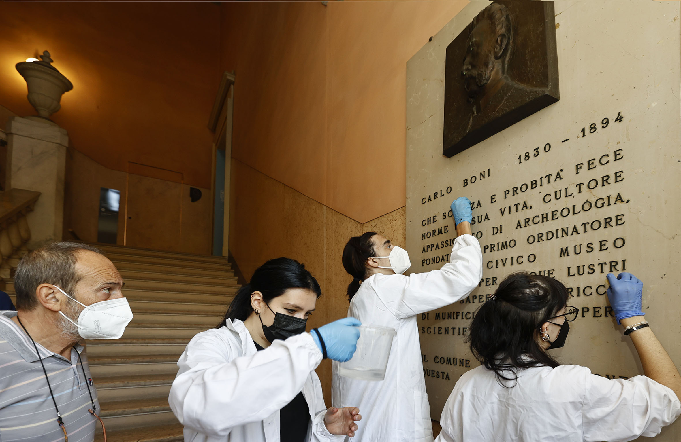 Muniti di secchi, spugne, stracci e prodotti detergenti specifici, con il camice bianco che contraddistingue i restauratori, i tre studenti del Liceo artistico Venturi assegnati al Museo civico per l’alternanza scuola-lavoro sono entrati oggi, martedì 14 settembre, nel vivo del progetto che prevede la pulizia della stele commemorativa di Carlo Boni, fondatore e primo direttore del Museo.