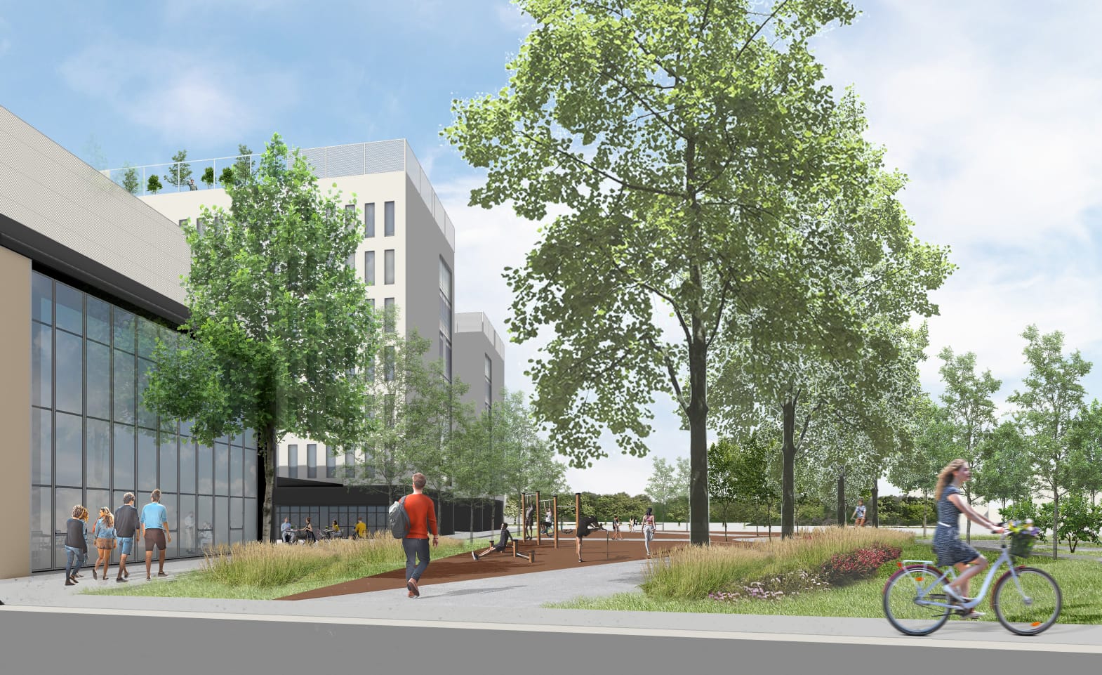 Le opere di urbanizzazione prevedono infine la realizzazione di parcheggi, camminamenti e attraversamenti pedonali e la piantumazione di molte e diverse alberature, oltre alla realizzazione di un nuovo parco, un’area verde attrezzata che connetterà le nuove funzioni e gli spazi urbani già presenti, ad oggi piuttosto carenti di aree verdi e di aggregazione, che quindi sarà a servizio degli utenti dello studentato come dei bambini delle vicine scuole e dei cittadini del quartiere.