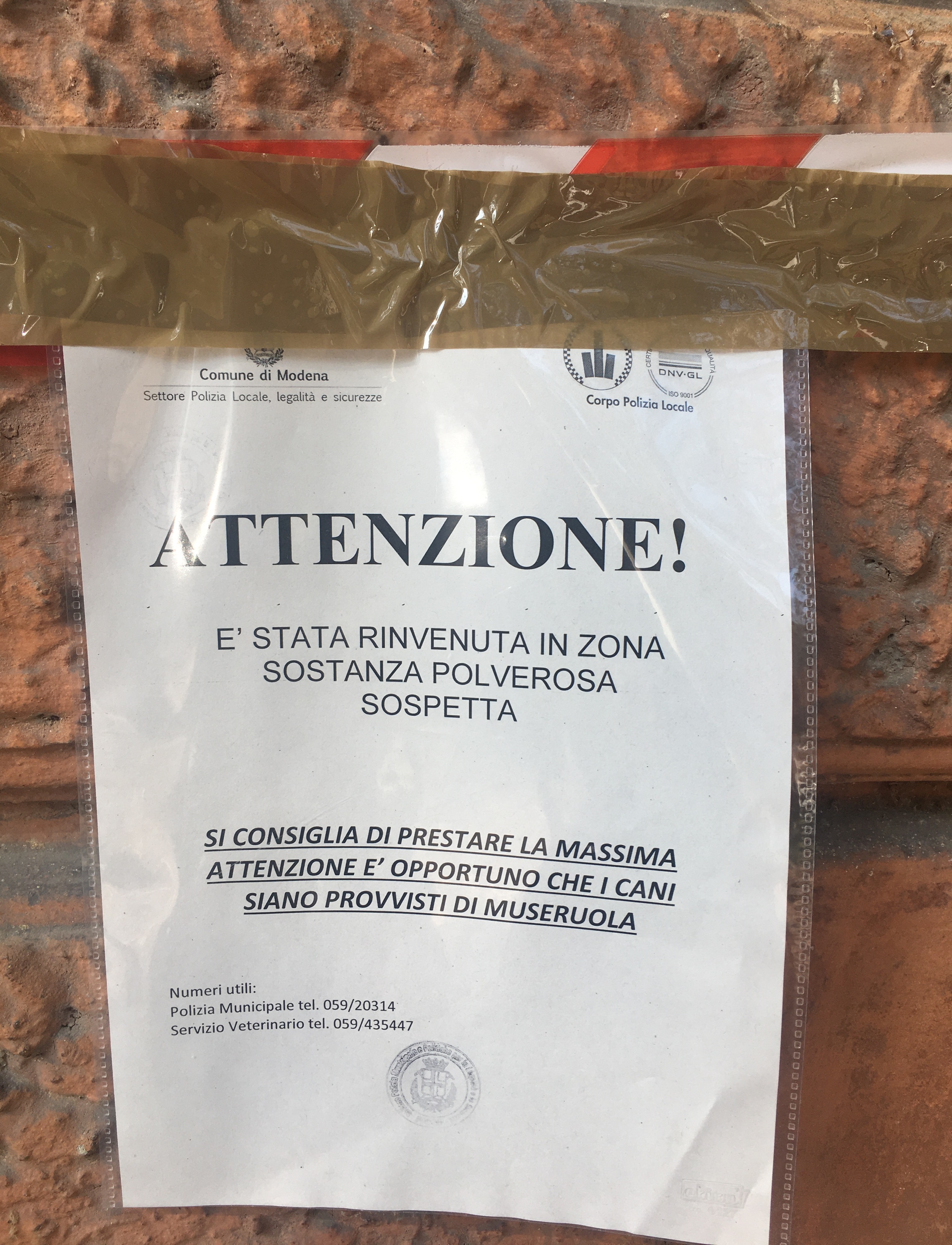 È probabilmente stata sparsa sul terreno in conseguenza alle deiezioni canine la polvere rinvenuta nei giorni scorsi in viale Vittorio Veneto, a Modena, e su cui sono in corso accertamenti all’istituto Zooprofilattico. Nel centro di via Diena, infatti, saranno eseguite le analisi necessarie a verificare l’eventuale presenza di sostanze tossiche o velenose che potrebbero nuocere a una persona o a un animale che dovesse toccarle o assumerle.