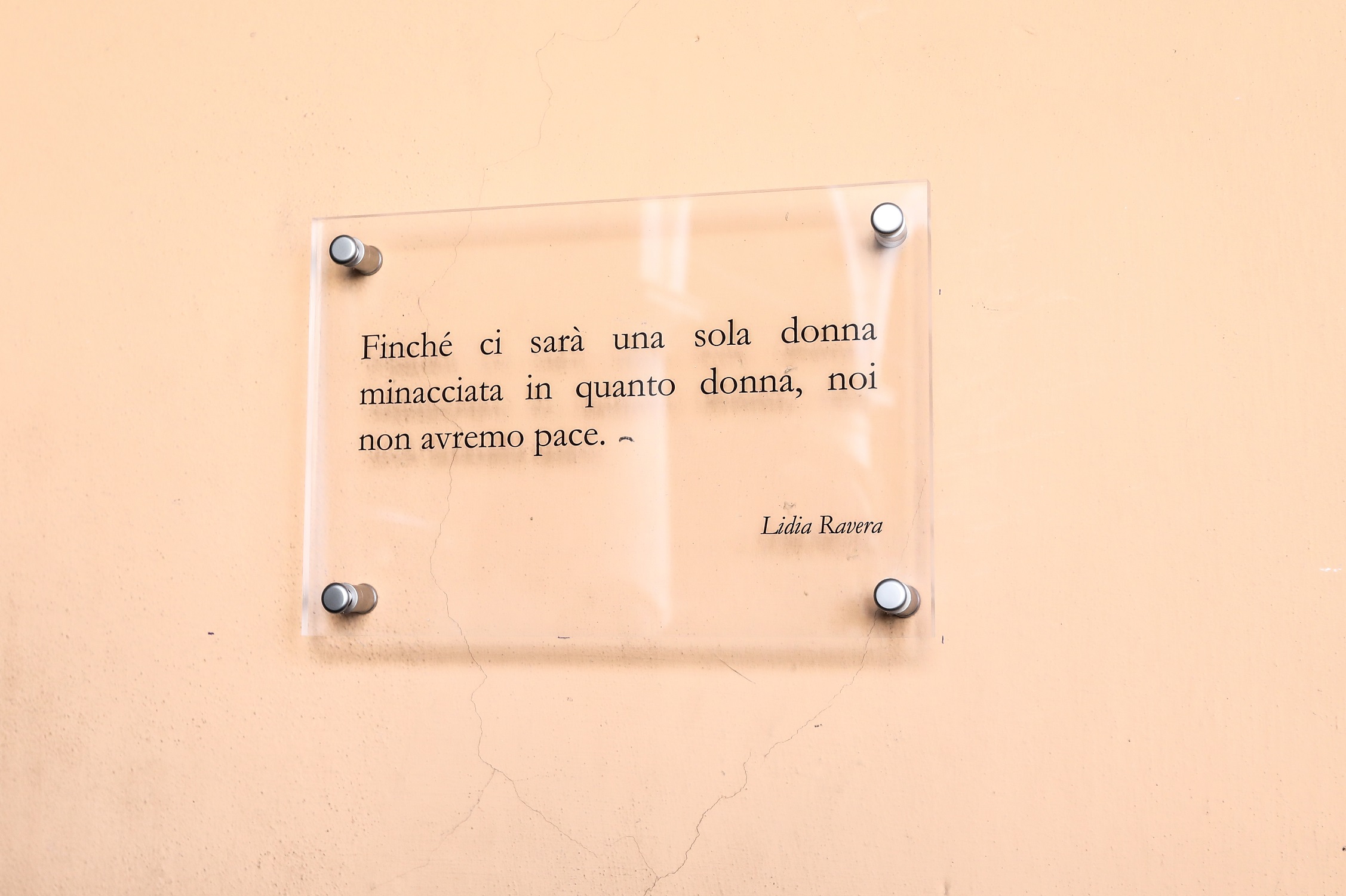 “Finché ci sarà una sola donna minacciata in quanto donna, noi non avremo pace”. È questa la frase, della scrittrice e giornalista Lidia Ravera, riportata sulla targa contro il femminicidio posta sul Palazzo Comunale come simbolo visibile del costante impegno nel combattere la violenza maschile contro le donne e, al tempo stesso, come memoria di tutte le vittime e promessa di deterrenza e prevenzione.