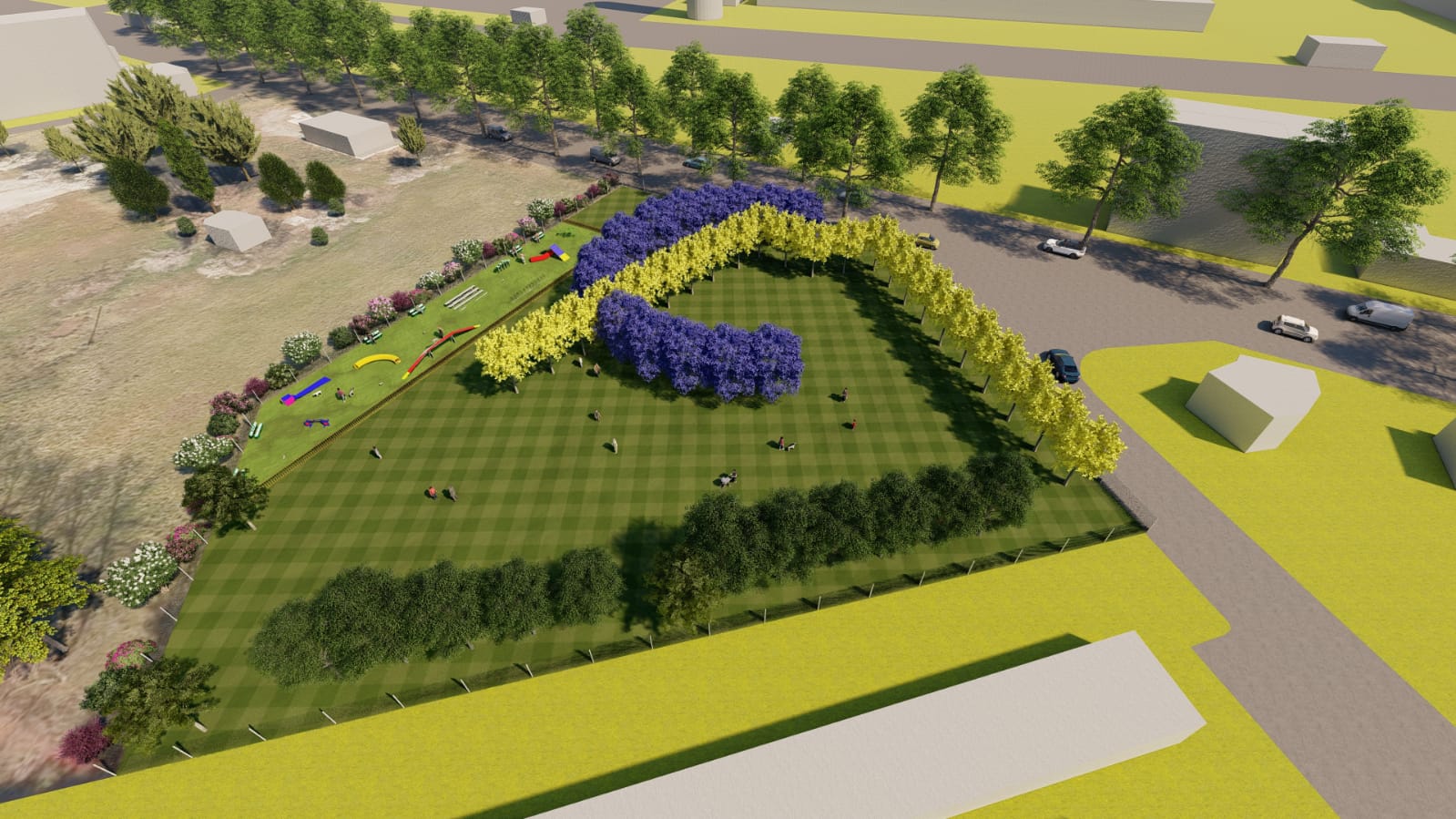 Gli alberi saranno piantumati in modo da comporre la “M” di Modena, con ginkgo biloba a fioritura gialla, e la “C” di Calcio, con i cosiddetti alberi dei rosari, a chioma blu, parzialmente incrociati tra loro. Le altre essenze previste, che andranno a contornare l’area e la zona dedicata ai cani, sono aceri campestri, peri, noccioli, frassini meridionali e bagolari.
