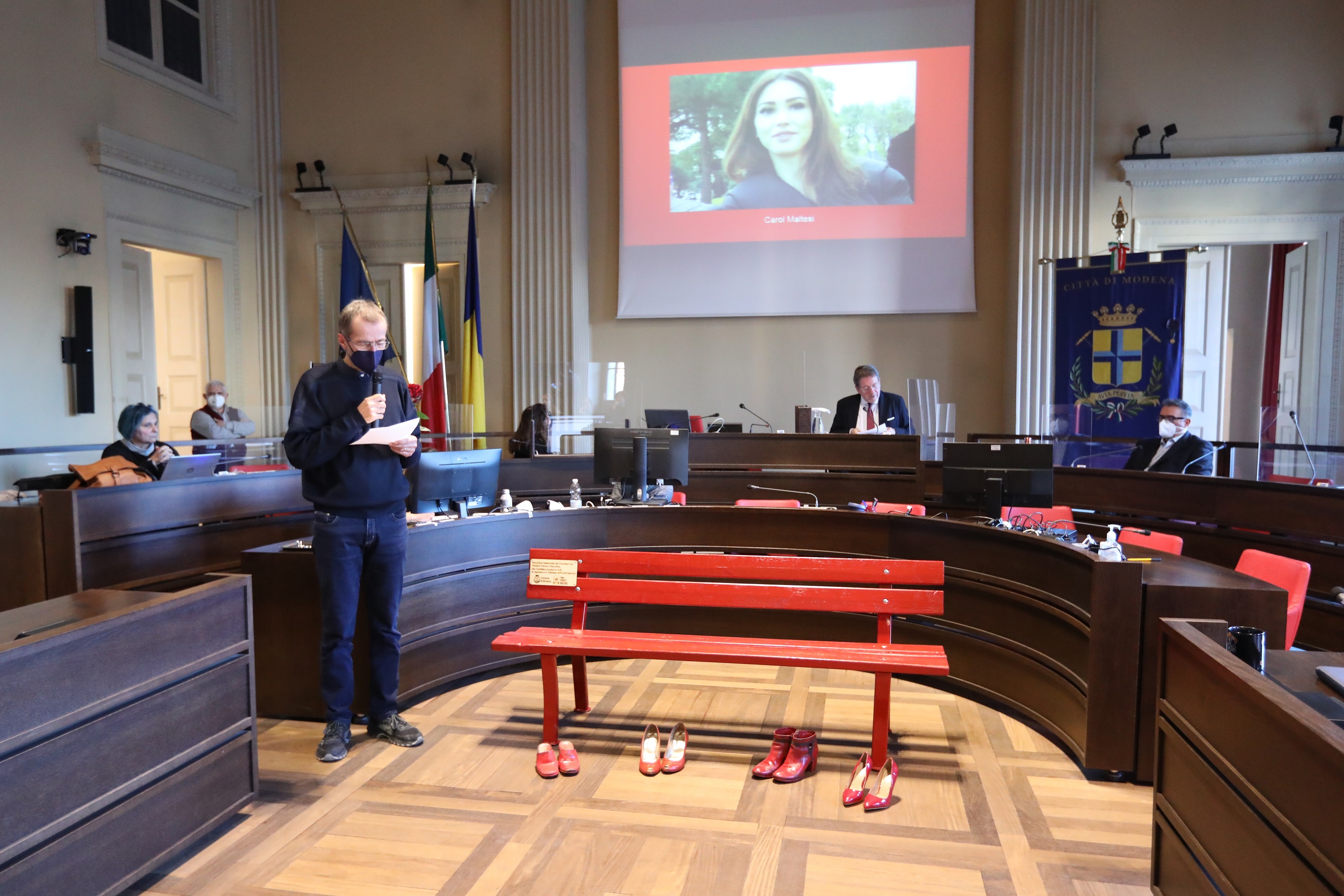 La lettura delle storie di queste donne, da parte del sindaco Gian Carlo Muzzarelli, del presidente del Consiglio Fabio Poggi e di tutti i capigruppo, è avvenuta sulla panchina rossa che è stata installata al centro dell’aula, circondata da scarpe rosse, come simbolo contro la violenza. Al termine della lettura di ogni storia, una rosa è stata posata sulla panchina come segno di memoria.