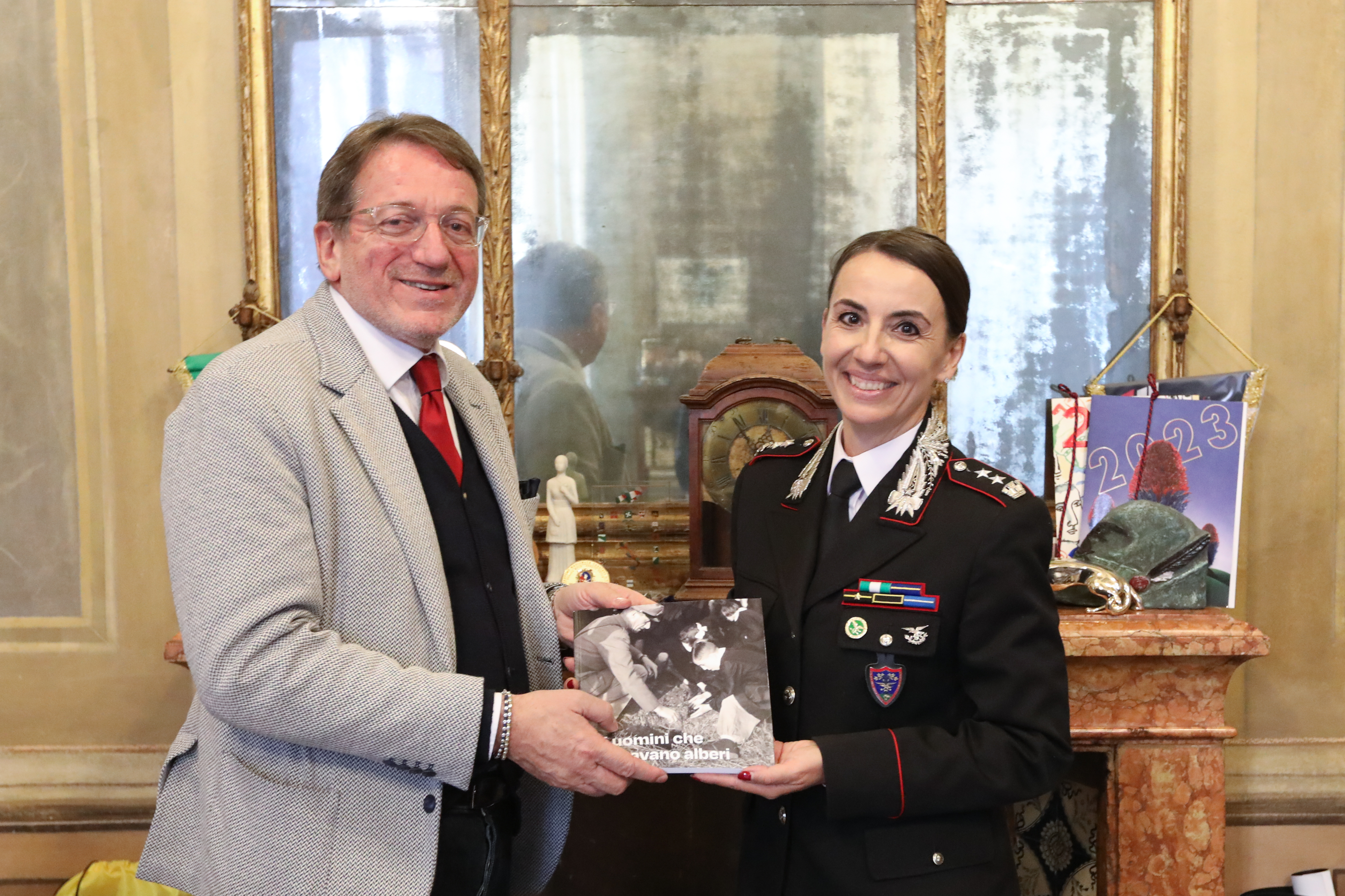 Inoltre, la comandante Laura Guerrini ha fatto dono al sindaco del volume “Gli uomini che piantavano alberi” tratto dalla mostra fotografica sulla trasformazione del paesaggio dell’Appennino Emiliano-Romagnolo, realizzata in occasione dei 200 anni dalla nascita del Corpo Forestale dello Stato, oggi Comando Unità Forestali, Ambientali e Agroalimentari dell’Arma dei Carabinieri. La mostra racconta le storie di uomini e donne che si sono adoperati per ampliare (a piantare gli alberi tra gli anni Cinquanta e Sessanta furono letteralmente tantissime donne che lavoravano nei vivai, mentre gli uomini erano impegnati nei cantieri) e tutelare il patrimonio forestale e naturale del Paese. La presenza femminile nel Corpo Forestale dello Stato è sempre stata importante; con il passaggio nel 2017 nell’Arma dei Carabinieri le prime tre donne Generali dell’Arma provengono proprio dal Corpo Forestale.