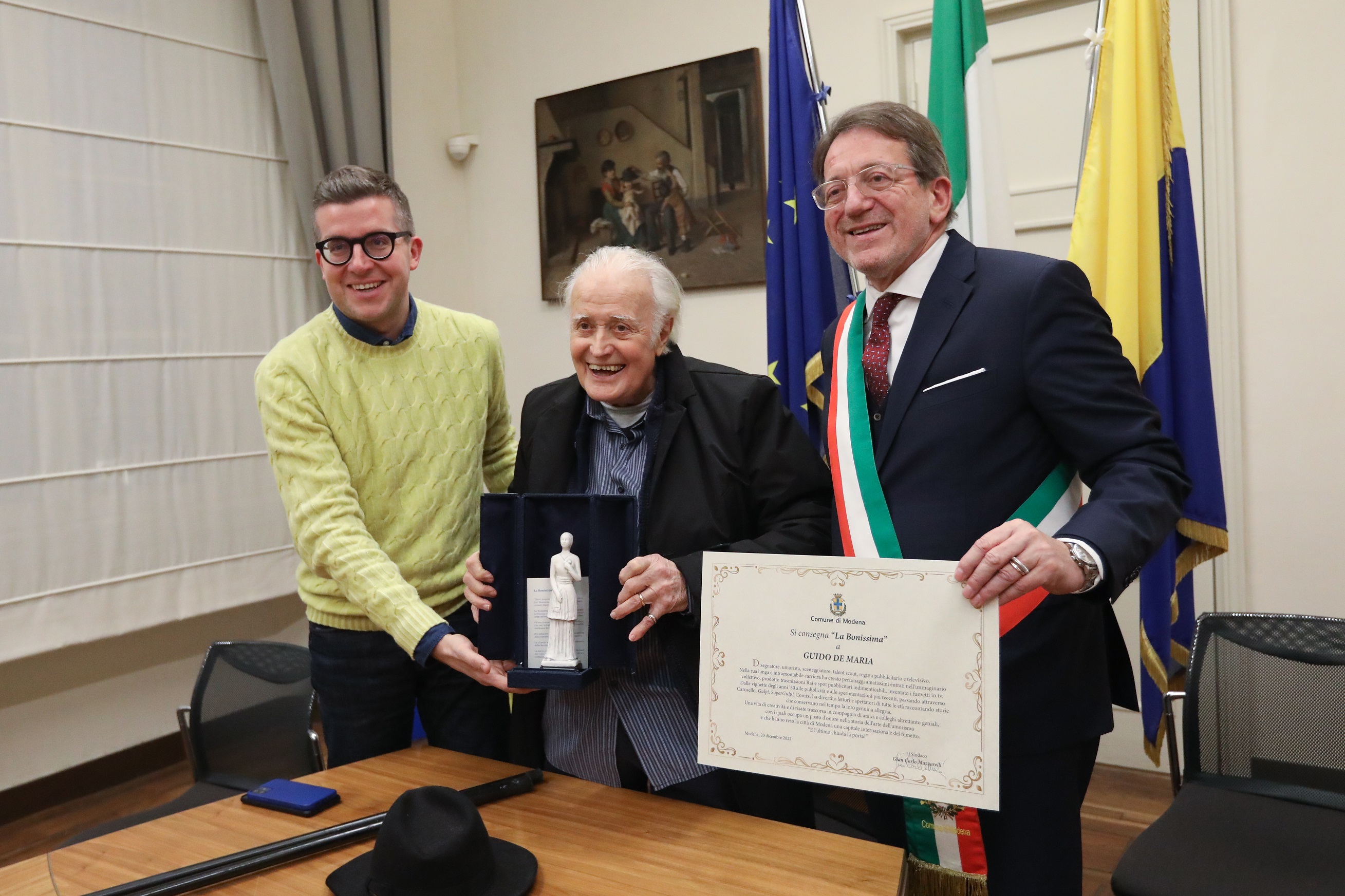La “Bonissima” per festeggiare il novantesimo compleanno di Guido De Maria, inventore dei fumetti in Tv, “padre” di Nick Carter e di molti altri personaggi di grande successo, e la sua lunghissima e straordinaria carriera. È stato il sindaco di Modena Gian Carlo Muzzarelli a consegnare, con l’assessore alla Cultura Andrea Bortolamasi il riconoscimento all’umorista, autore e regista modenese nel pomeriggio di oggi, martedì 20 dicembre, nel corso dell’incontro che si è svolto a Palazzo Comunale e al quale ha partecipato anche Beppe Cottafavi, direttore del Dondolo, la casa editrice on line del Comune di Modena, che ha presentato a De Maria l’ebook a lui dedicato, pubblicato proprio in occasione del compleanno, e intitolato “Gulp! Supergulp! Fumetti in Tv”.