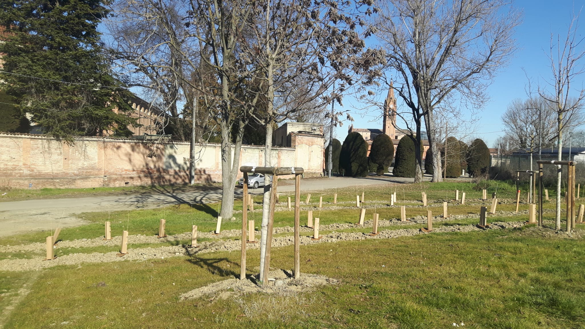Lungo il percorso ciclopedonale sono state piantate specie poco esigenti e adattabili, anche con valore ornamentale, utilizzando una percentuale maggiore di alberi di piccola dimensione e di arbusti. Per l’area antistante il cimitero, sono state scelte specie autoctone e specie fruttifere con prevalenza di alberi in modo da bilanciare la vegetazione spontanea. Tra le essenze utilizzate ci sono acero campestre, bagolaro, ciliegio selvatico, frassino e pioppo, nocciolo, mirto e alloro; tra gli arbusti corniolo, rosa selvatica, ligustro selvatico, lantana, sambuco nero, olivello spinoso e ginestra di Spagna.