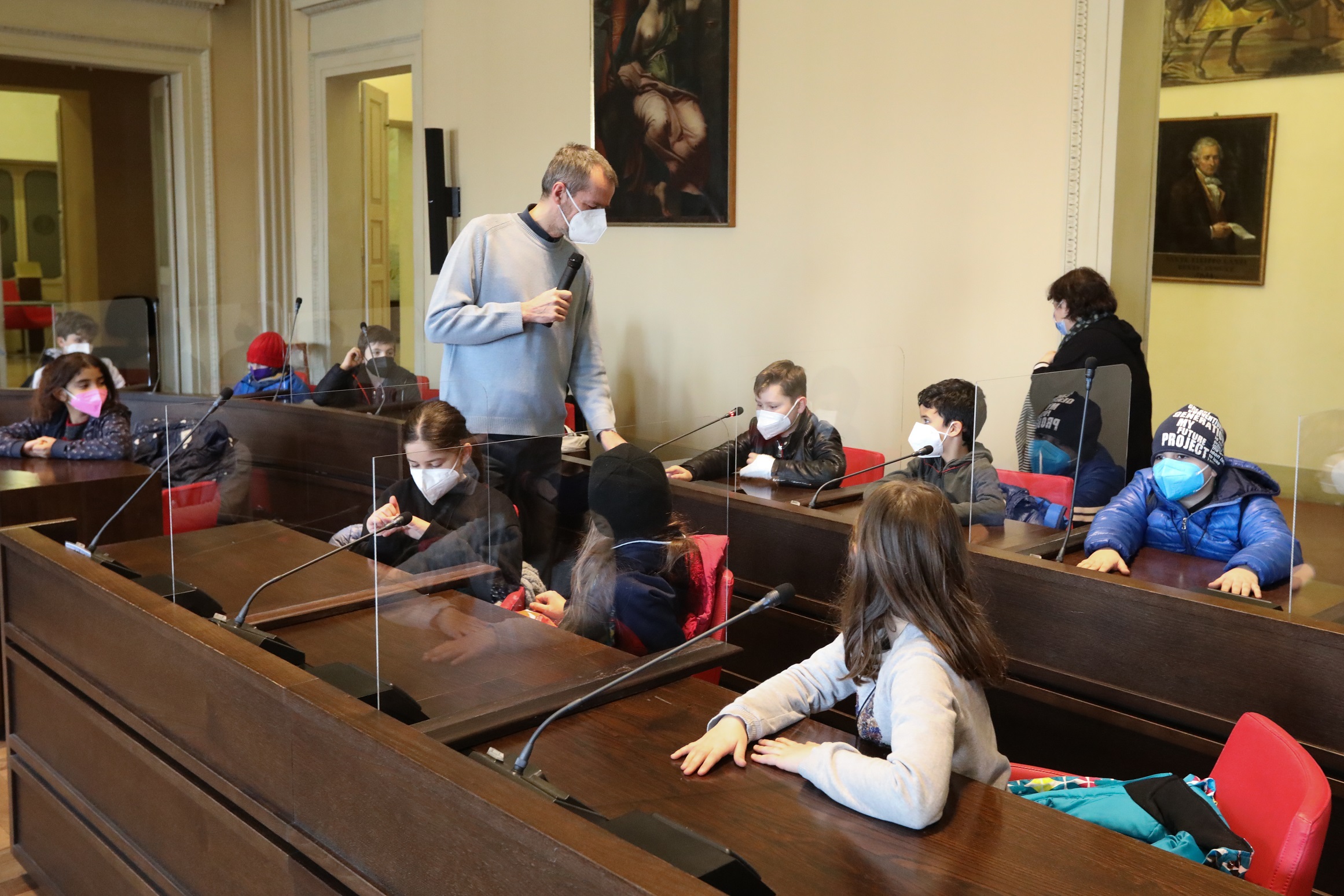 I circa cinquanta allievi delle quarte B e D della scuola Galilei, accompagnati dalle loro maestre, sono arrivati in Municipio a piedi, dopo una camminata di circa 45 minuti. Alla lora prima uscita dopo due anni di pandemia, hanno subissato di domande il presidente Poggi, chiedendo anche se “nel prendere decisioni conta di più la matematica o la tecnologia” e mostrandosi molto curiosi anche sulla sala, chiedendo delle lapidi affisse al muro, che ricordano la riconquista delle libertà dopo la dittatura fascista, ma anche dei draghi dipinti sul soffitto.