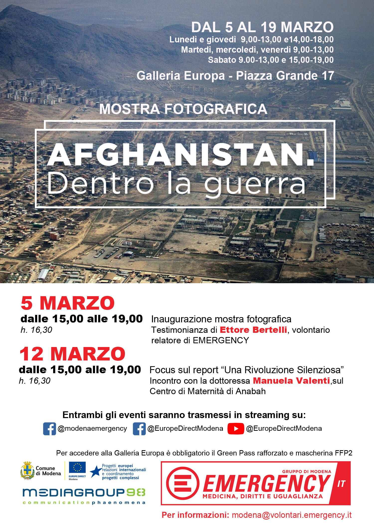 All’inaugurazione della mostra, promossa da Emergency e dal Centro Europe Direct del Comune di Modena (in collaborazione con Mediagroup98), interverranno Anna Maria Lucà Morandi, assessora a Europa e Cooperazione internazionale del Comune di Modena, ed Ettore Bertelli, volontario di Emergency che porterà la sua testimonianza.