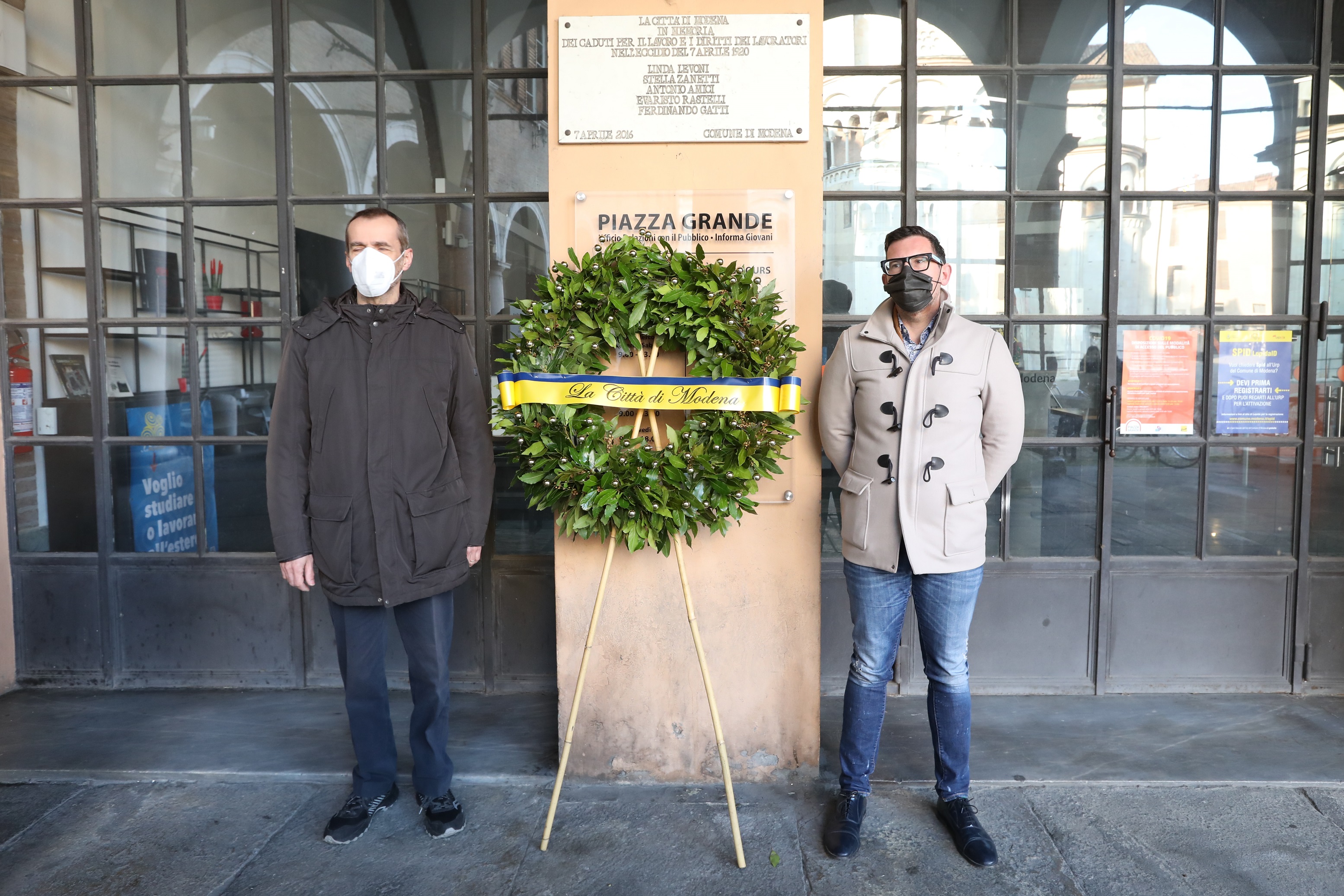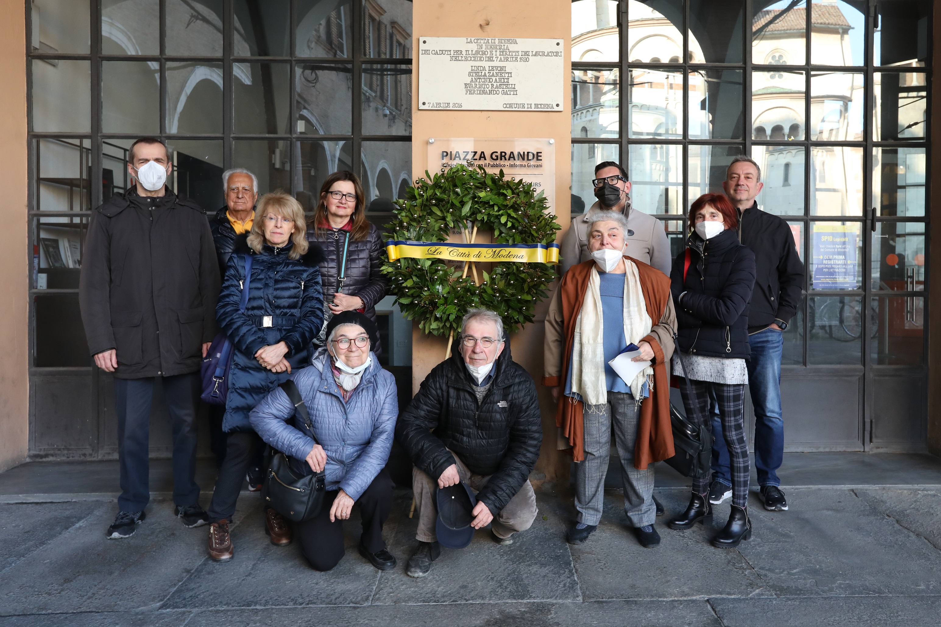 Alle 8.30, ai piedi dello Scalone del Municipio, dove nel 2016 il Comune aveva collocato una targa commemorativa, è stata deposta una corona con un nastro gialloblù e la scritta “La città di Modena”. Assieme all’assessore alle Politiche per il lavoro e la legalità Andrea Bosi e al presidente del Consiglio comunale Fabio Poggi, alla cerimonia hanno partecipato alcuni discendenti delle cinque persone uccise durante la repressione da parte della forza pubblica: Linda Levoni, Stella Zanetti, Antonio Amici, Evaristo Rastelli e Ferdinando Gatti. In particolare, erano presenti Anna Maria Borghi, Paolo Borghi, Milena Nicolini, Carlo Alberto Gatti, Luisa Gatti, Paola Gatti, Marco Gatti, Beatrice Trenti e Susanna Ripanti.
