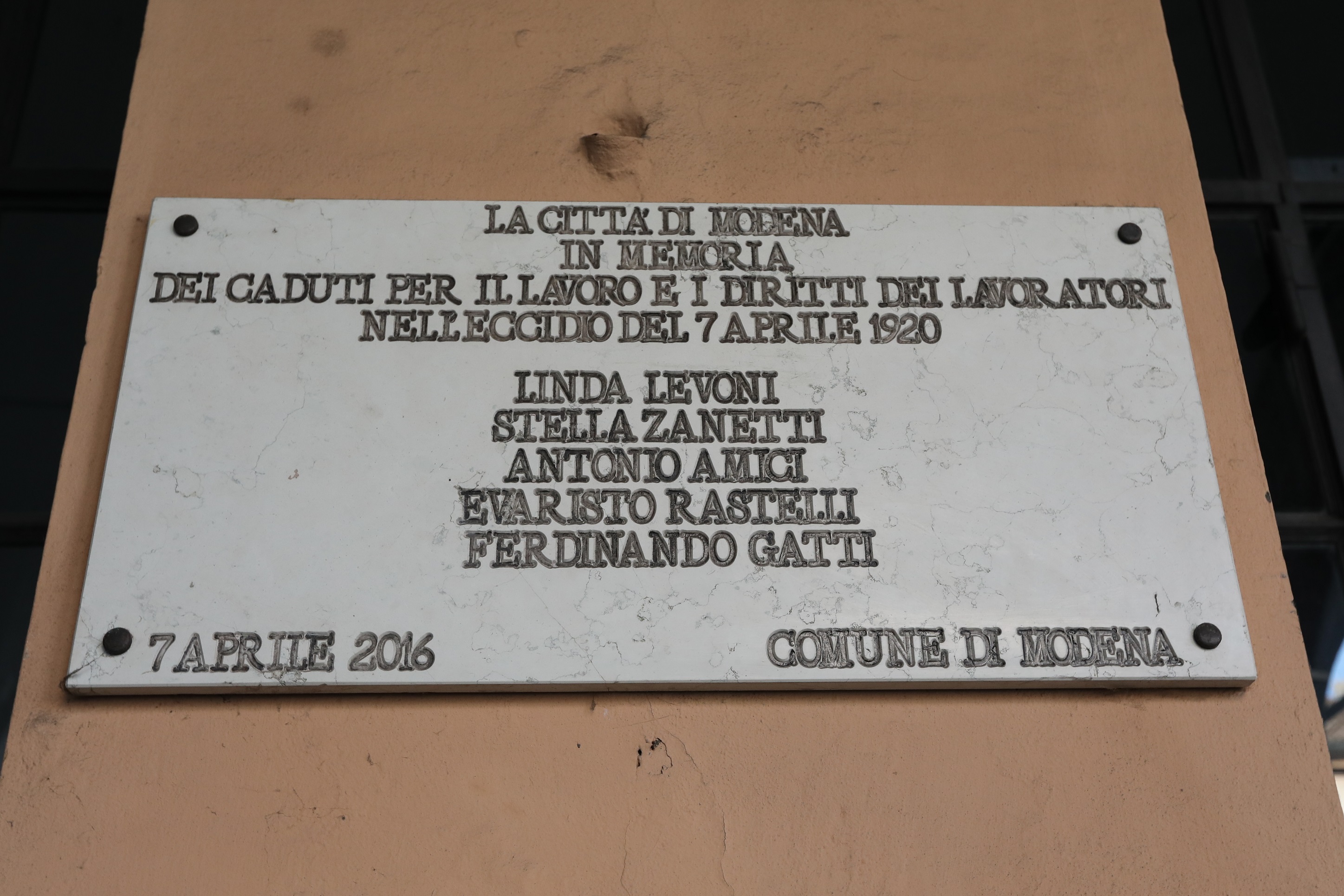 Il 7 aprile 1920, durante il primo dei quattro giorni di sciopero proclamati dalle due Camere del Lavoro (quella Sindacalista e quella Socialista) per protestare contro l’uccisione a San Matteo della Decima di otto lavoratori e dell’oratore durante una manifestazione a sostegno di una vertenza agraria, i lavoratori modenesi si radunarono in piazza Grande dove la forza pubblica aprì il fuoco, uccidendo quattro persone e provocando la morte di una quinta a seguito delle ferite riportate.