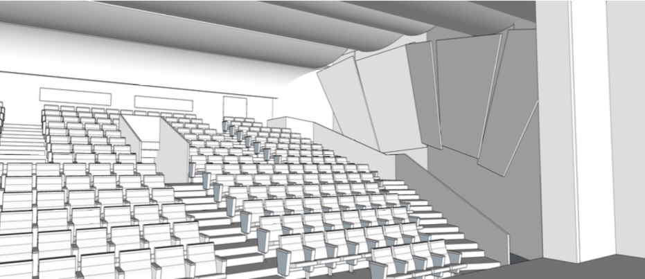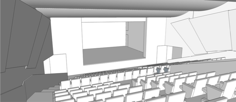 La gradinata per gli spettatori, anch’essa rivolta verso nord, sarà un elemento libero e centrale che non poggerà sulle pareti perimetrali del fabbricato e le sedute delle prime file saranno raggiungibili anche agli spettatori diversamente abili attraverso due percorsi provenienti dall’ingresso e dal foyer in lieve pendenza verso il palco. Un ingresso centrale, invece, collegherà direttamente il foyer con la parte alta della gradinata.