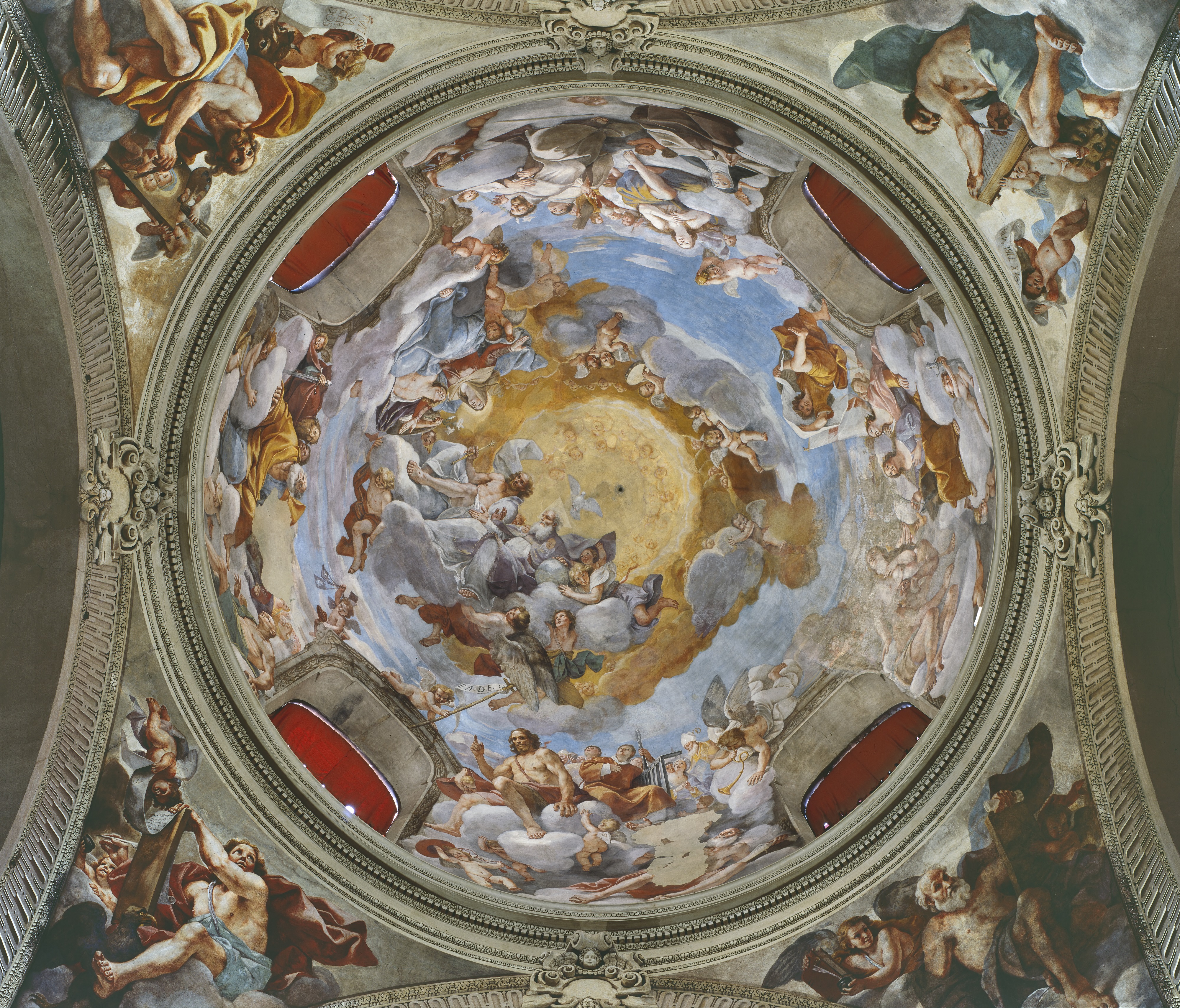Oltre all’affresco la “Vergine accolta in cielo” nella cupola, all’interno della storica chiesa oggetto di rafforzamento sismico e restauro decorativo, altre opere sono da attribuire a Mattia Preti: il “Concerto d’angeli” nel coro e gli “Evangelisti” dei pennacchi sottostanti. Il tema del concerto, ampiamente praticato in pittura da oltre un secolo, mai era stato tradotto in forme tanto monumentali: un angelo al centro dirige una vera e propria orchestra in cui i musicisti, muniti di numerosi strumenti, accompagnano un ampio coro di voci angeliche.