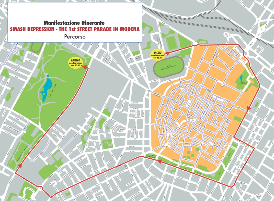 Lo Street Parade prende il via alle 15 dal Novisad (ritrovo dalle 14) per transitare in diverse strade cittadine (Monte Kosica, viale Crispi, piazzale Natale Bruni, viale Caduti in Guerra, largo Garibaldi, viale Trento Trieste, viale Muratori, via Giardini, viale Corassori, viale Italia) fino ad arrivare al Parco Ferrari intorno alle 20. In corrispondenza del passaggio del corteo, lungo il percorso autorizzato viene sospesa la circolazione e si adottano le opportune deviazioni.