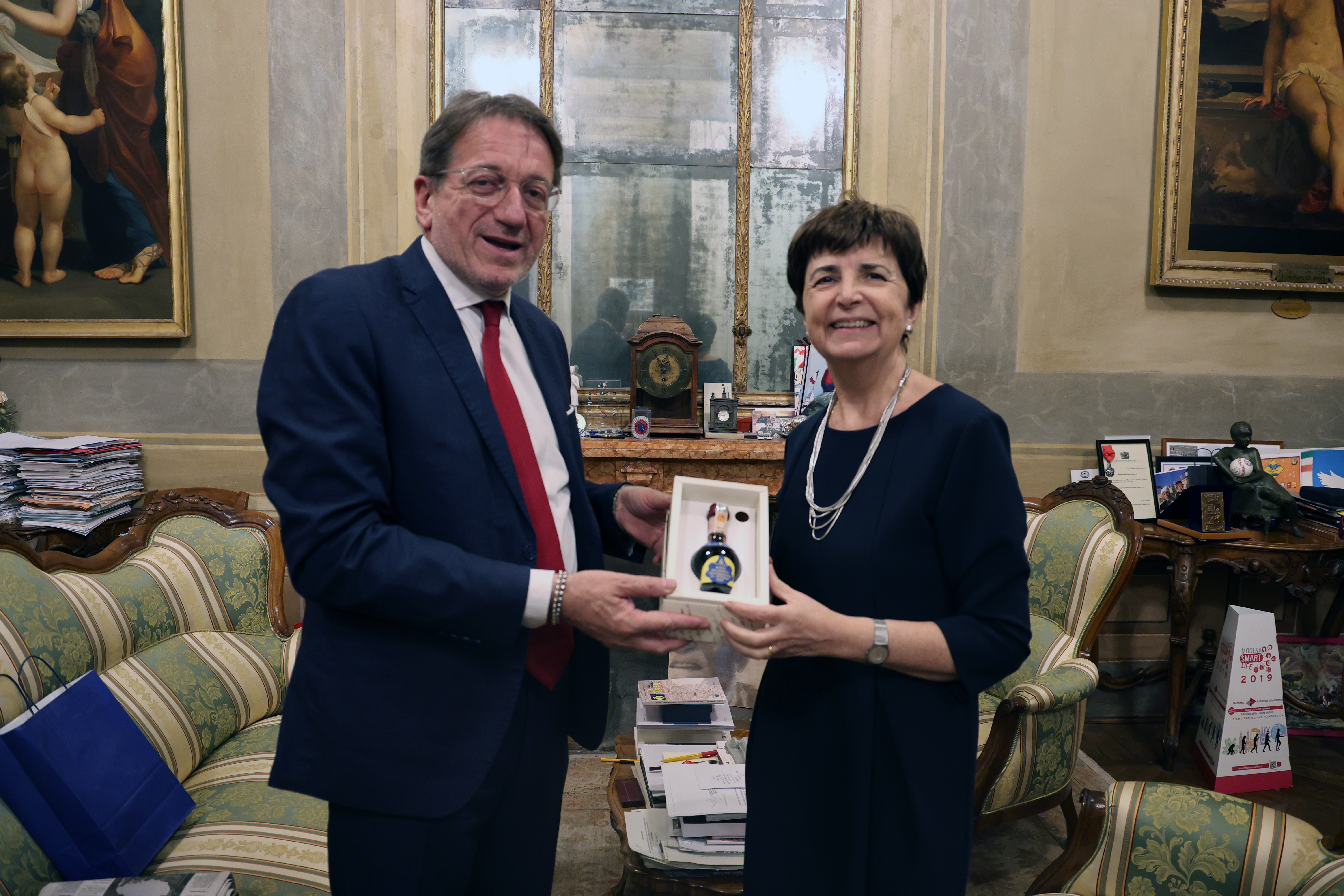 Al termine dell’incontro il sindaco Muzzarelli ha donato alla dottoressa Burdese una bottiglietta di Aceto balsamico tradizionale di Modena dell’Acetaia comunale (“le avevo detto da subito che avrebbe dovuto meritarselo”, ha commentato sorridendo) e il volume di Beppe Zagaglia “Ritorno a Modena”, come invito a non dimenticare la città.