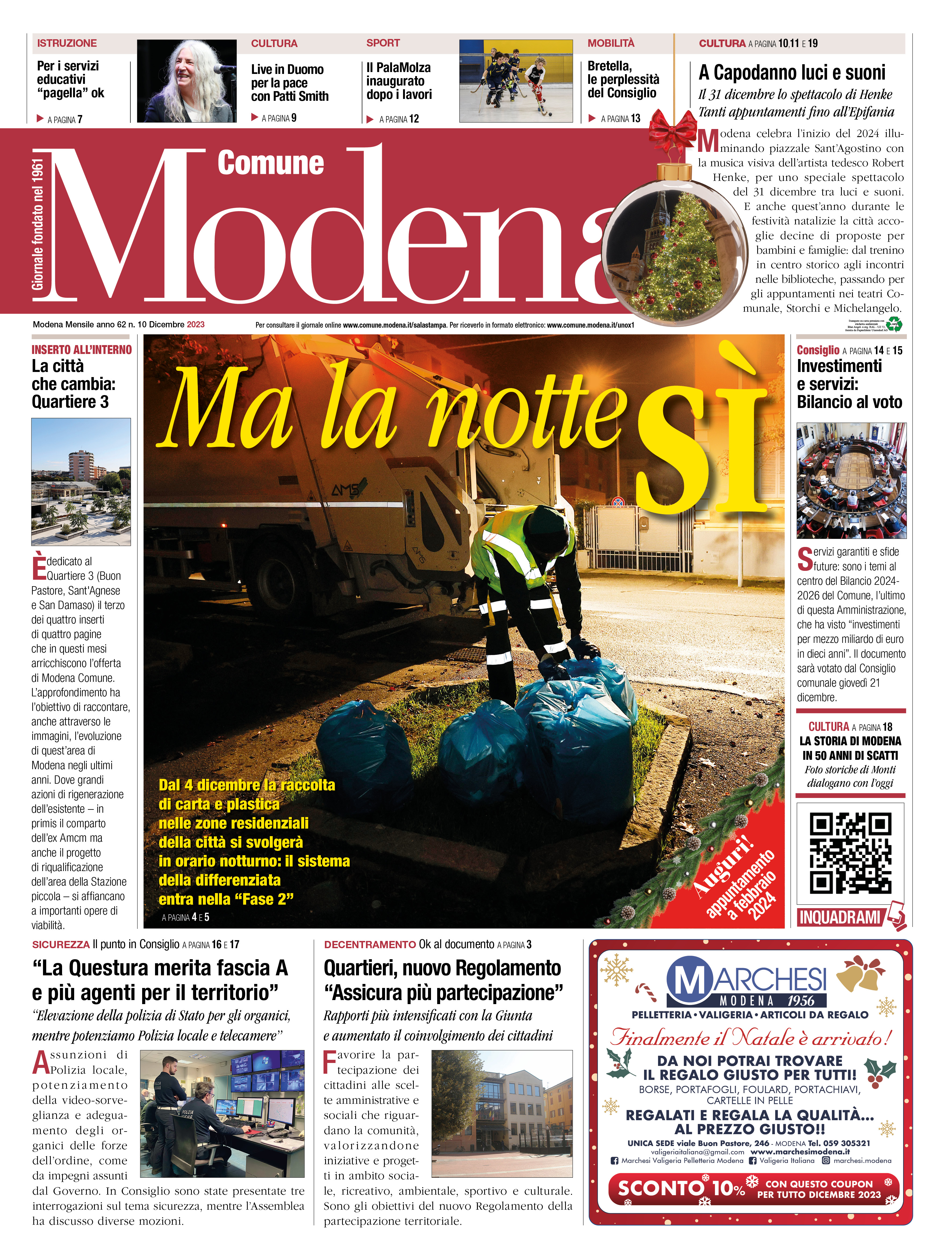 Alle novità che riguardano il nuovo sistema di raccolta dei rifiuti sono dedicate anche la copertina (col titolo “Ma la notte Sì”) e un approfondimento del numero di dicembre di “Modena Comune”, il periodico dell’Amministrazione comunale in distribuzione in questi giorni e già online e leggibile sul sito web del Comune in sala stampa (www.comune.modena.it/salastampa) con servizi pure su altri argomenti di attualità e di cultura, tra cui l’annuncio dello spettacolo di Capodanno con l’esibizione tra laser e suoni dell’artista Robert Henke, e sull’attività del Consiglio comunale. Il mensile ospita anche, all’interno, il terzo dei quattro inserti di quattro pagine che in questi mesi, con speciali sui diversi Quartieri, arricchiscono l’offerta del giornale.