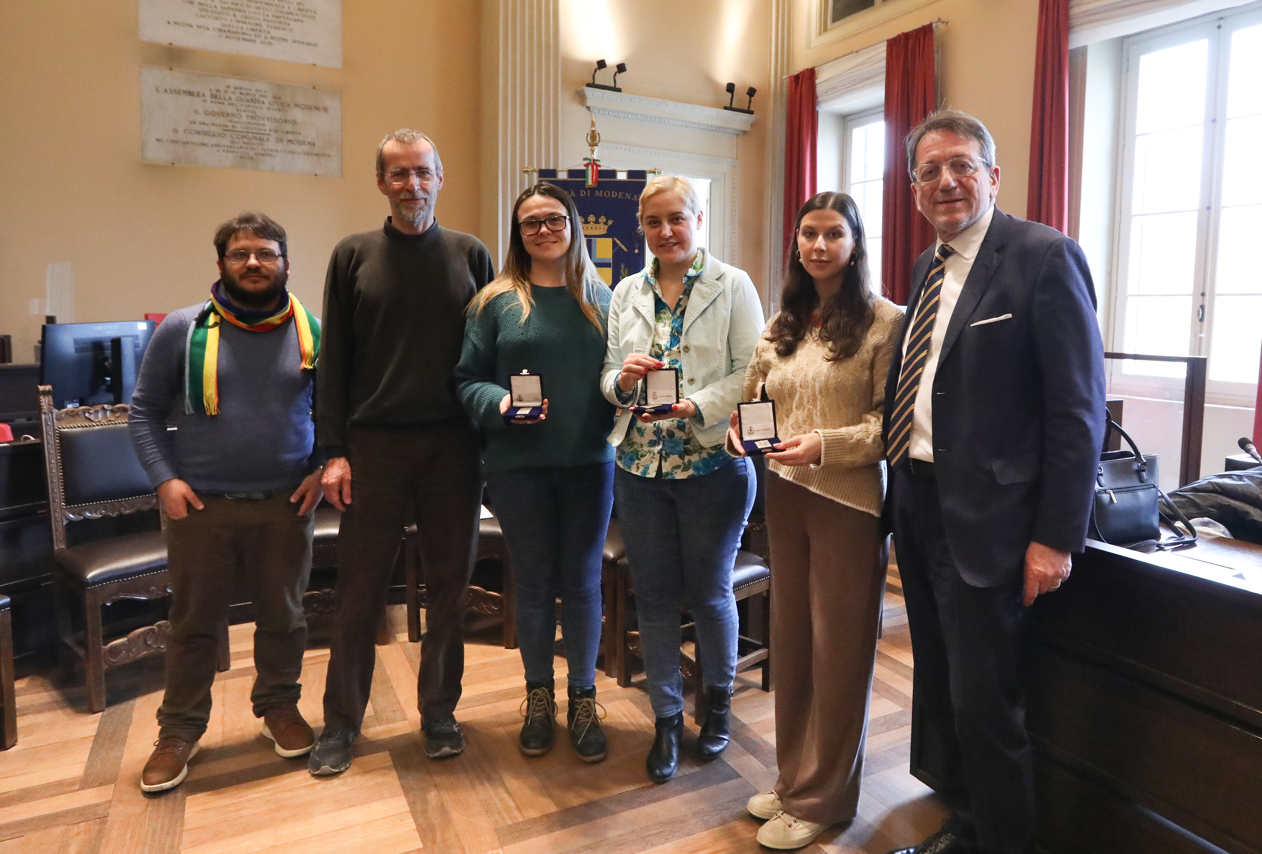 “Proseguire l’accoglienza e l’ascolto dei popoli oppressi dal conflitto, seminando positività e costruendo concretamente un ponte per la pace”. Con queste parole il sindaco Gian Carlo Muzzarelli ha salutato nella mattinata di oggi, giovedì 23 febbraio, tre giovani attiviste per la pace provenienti da Ucraina, Russia e Bielorussia, alle quali ha consegnato la medaglia che riproduce la Bonissima, “emblema di operosità e bene comune, come la pace”.