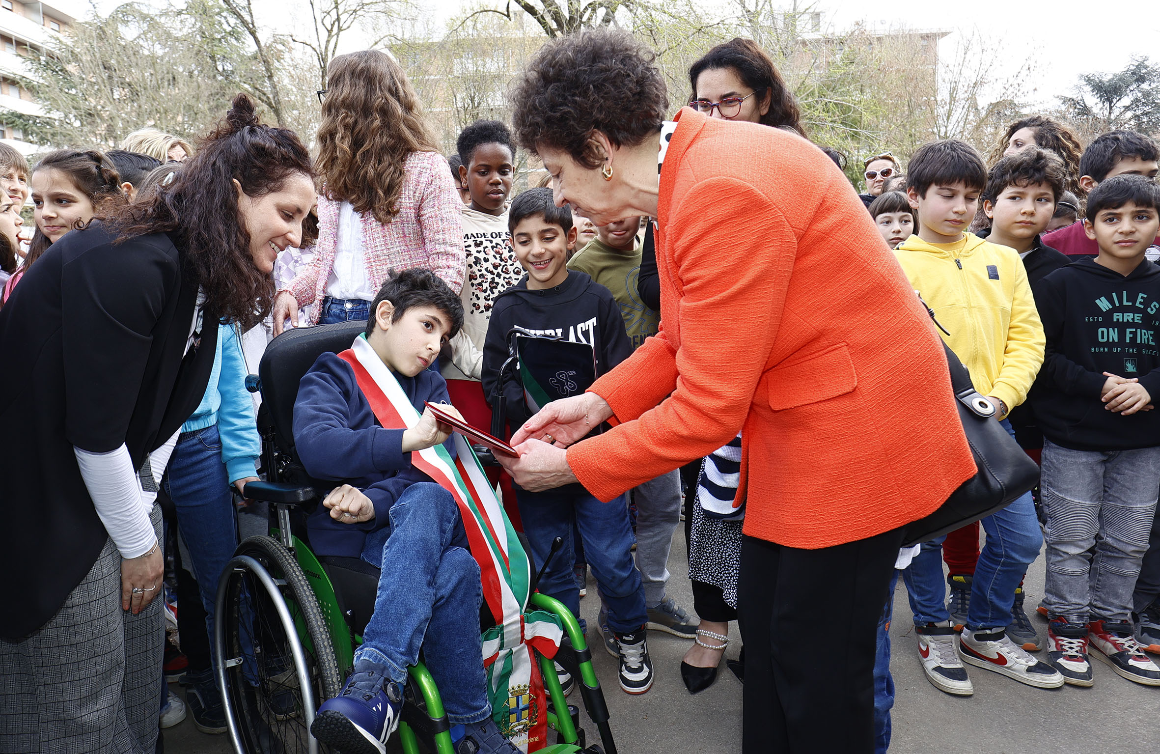 “Questo momento di gioia e condivisione – ha affermato il sindaco Gian Carlo Muzzarelli, che ha donato la propria fascia tricolore a Mattia – ci ricorda cosa significa davvero comunità: luogo in cui tutti devono sentirsi protagonisti e accolti a cuore aperto”. La prefetta Alessandra Camporota ha condiviso l’emozione del presidente Mattarella non appena raggiunto dalla storia di Mattia: “Ha voluto scrivere direttamente lui il messaggio, utilizzando un biglietto informale, destinato solo ai suoi amici”. Il presidente del Consiglio comunale Fabio Poggi ha voluto invece “investire” Mattia del ruolo di promotore della Costituzione: “Da oggi avrà il compito di invitare tutti gli amici a scoprirla”. A lui e a ognuna delle classi della scuola Poggi ha donato una copia per bambini del testo costituzionale, corredata da attività laboratoriali, anche digitali.