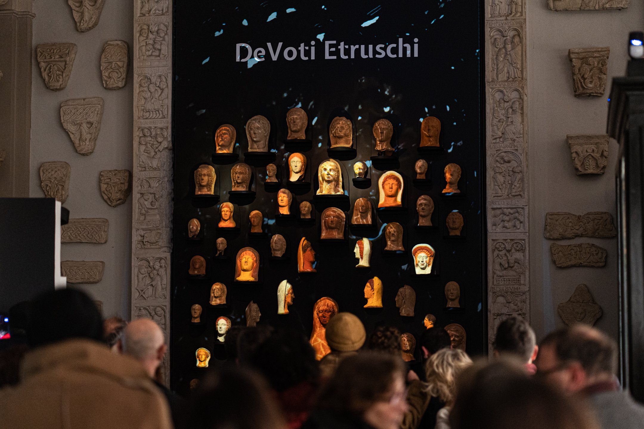 Un video introduce il contesto da cui provengono i reperti e una suggestiva installazione video-sonora (realizzata da Delumen) fa rivivere i volti degli offerenti, i devoti Etruschi, rappresentati da oltre cinquanta teste e una grande statua che osservano il visitatore da un pannello incorniciato nel calco del portale dell’abbazia di Nonantola (esposto nella sala), quasi a evocare un luogo denso di spiritualità e nello stesso tempo la funzione di accoglienza di ex voto che le chiese tuttora esercitano.