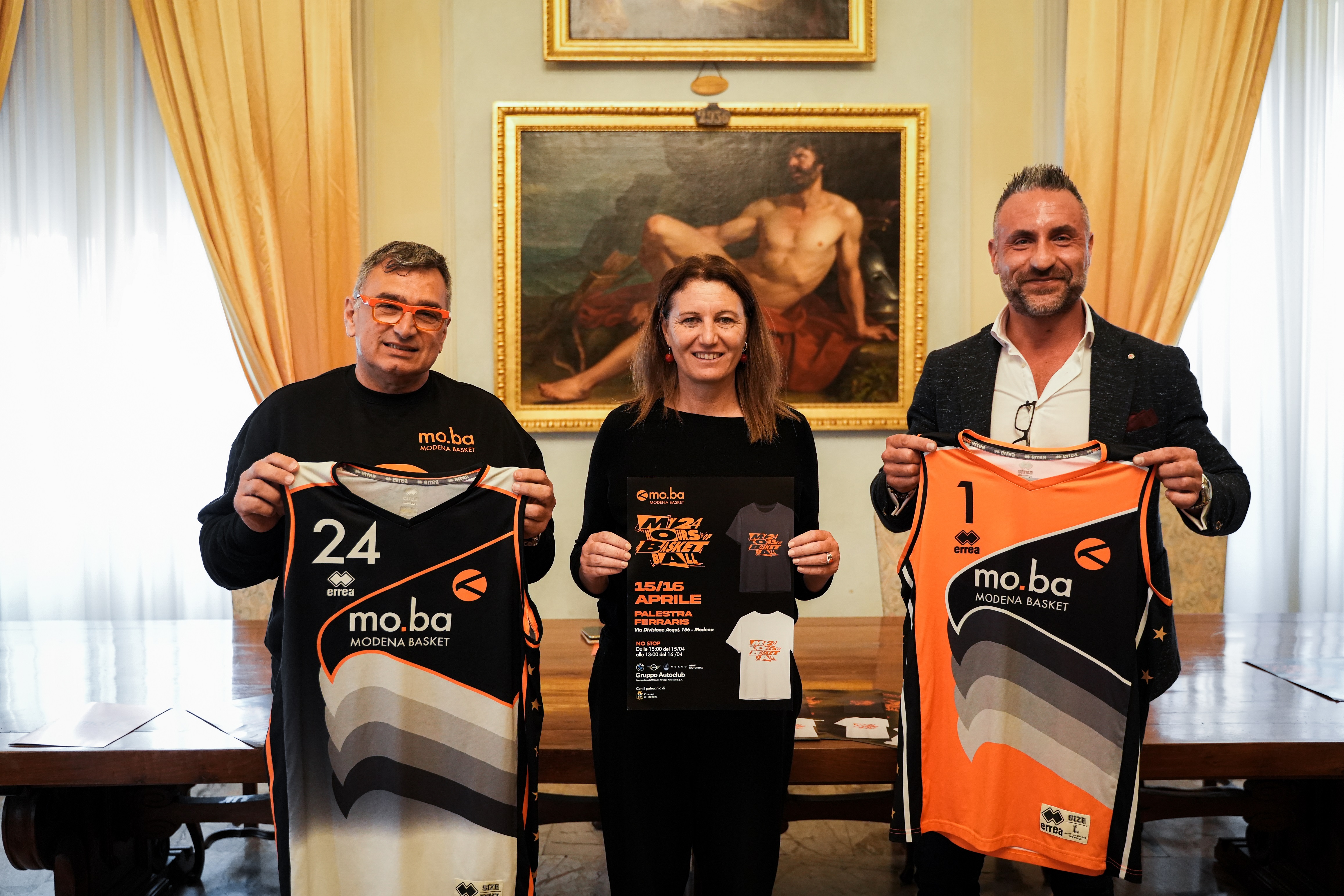 L’edizione 2023 della “24 ore”, denominata “Moba - My 24 hours of basketball”, è stata presentata in Municipio oggi, venerdì 14 aprile, da Claudio Coppeta e Gianni Nardiello, rispettivamente direttore tecnico e responsabile commerciale di Modena Basket, con la partecipazione dell’assessora allo Sport del Comune di Modena Grazia Baracchi.