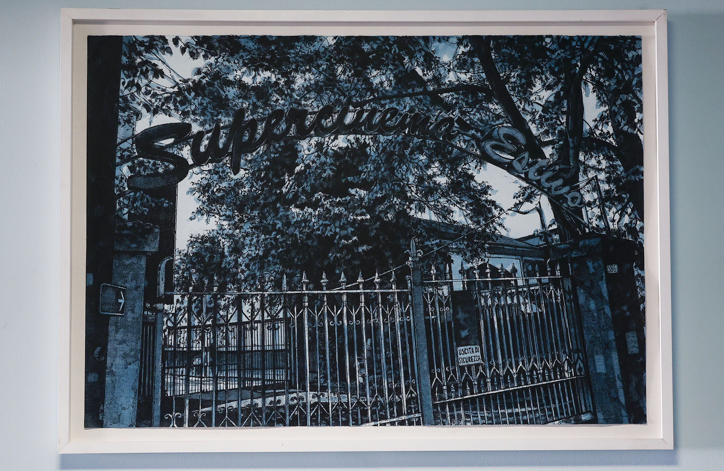 Il dipinto, in inchiostro su carta, delle dimensioni di un poster, raffigura, appunto, l’insegna del Supercinema estivo ed è stato realizzato nel 2022.