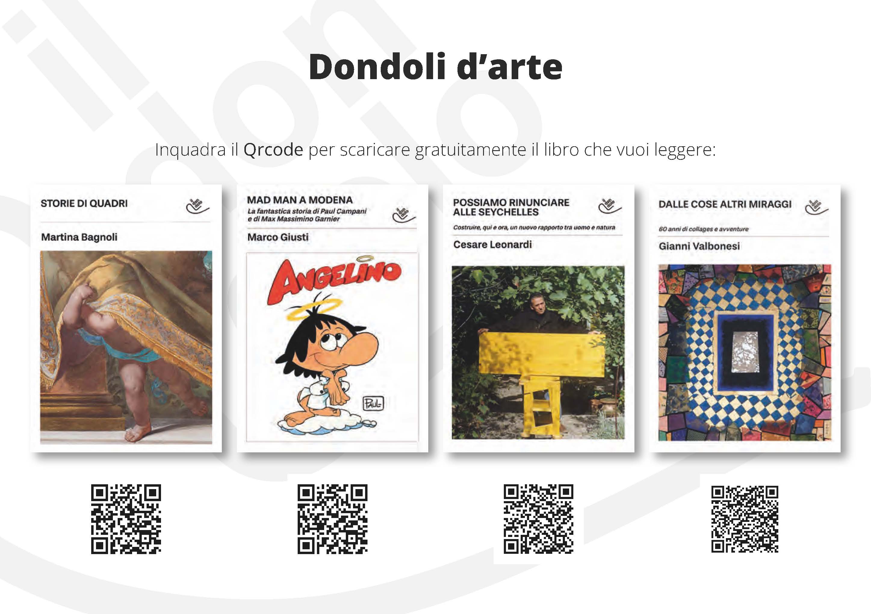 Il Dondolo, con il sostegno di Bper Banca, produce ebook inediti di fiction, non fiction, saggistica, arte e poesia, con un’attenzione particolare alle storie notevoli del territorio modenese. In catalogo Walter Siti, Edmondo Berselli, Carlo Lucarelli, Barbara Baraldi, Stefano Massini, ma anche i recuperi storici di Antonio Delfini, Silvio D’Arzo, Angelo Fortunato Formiggini e contributi critici di Natalia Ginzburg, Pier Paolo Pasolini, Cesare Garboli. Ci sono poi gli ebook dedicati a Luigi Ghirri, Gianni Celati, Cesare Leonardi, Vasco Rossi, Paul Campani e la storia meravigliosa della Paul Film, Gulp e Supergulp, la storia dei fumetti in tv, i capolavori della Pinacoteca Estense e un’antologia dei migliori scrittori emiliani.