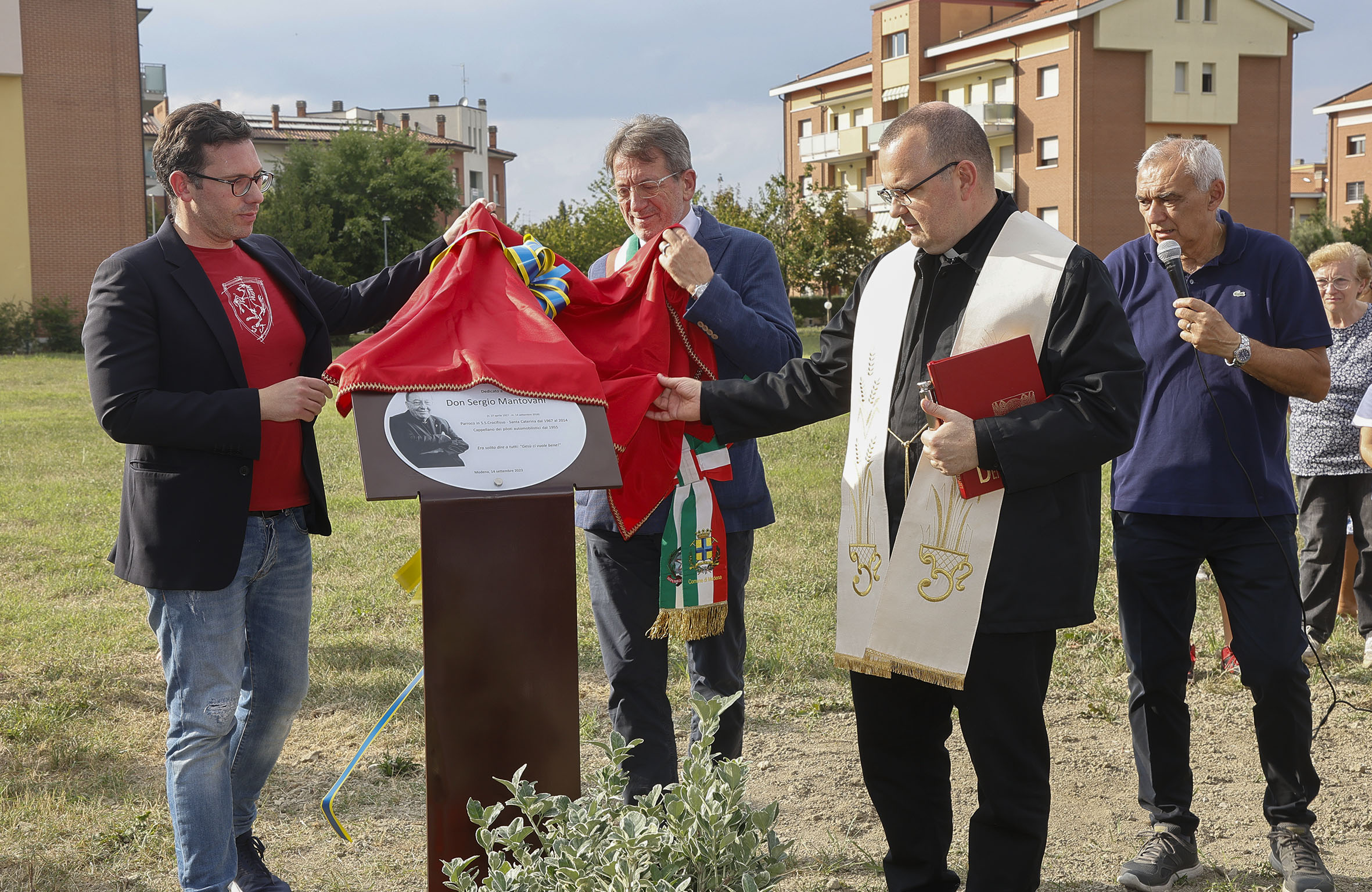 La targa, posizionata su una stele con basamento, ricorda Don Sergio Mantovani con una sua foto e con gli impegni pastorali: “Parroco in S.S. Crocifisso – Santa Caterina dal 1967 al 2014 e cappellano dei piloti automobilistici dal 1955” è stata collocata nel lato del parco Santa Caterina raggiungibile dall’accesso di via Mar di Sardegna.